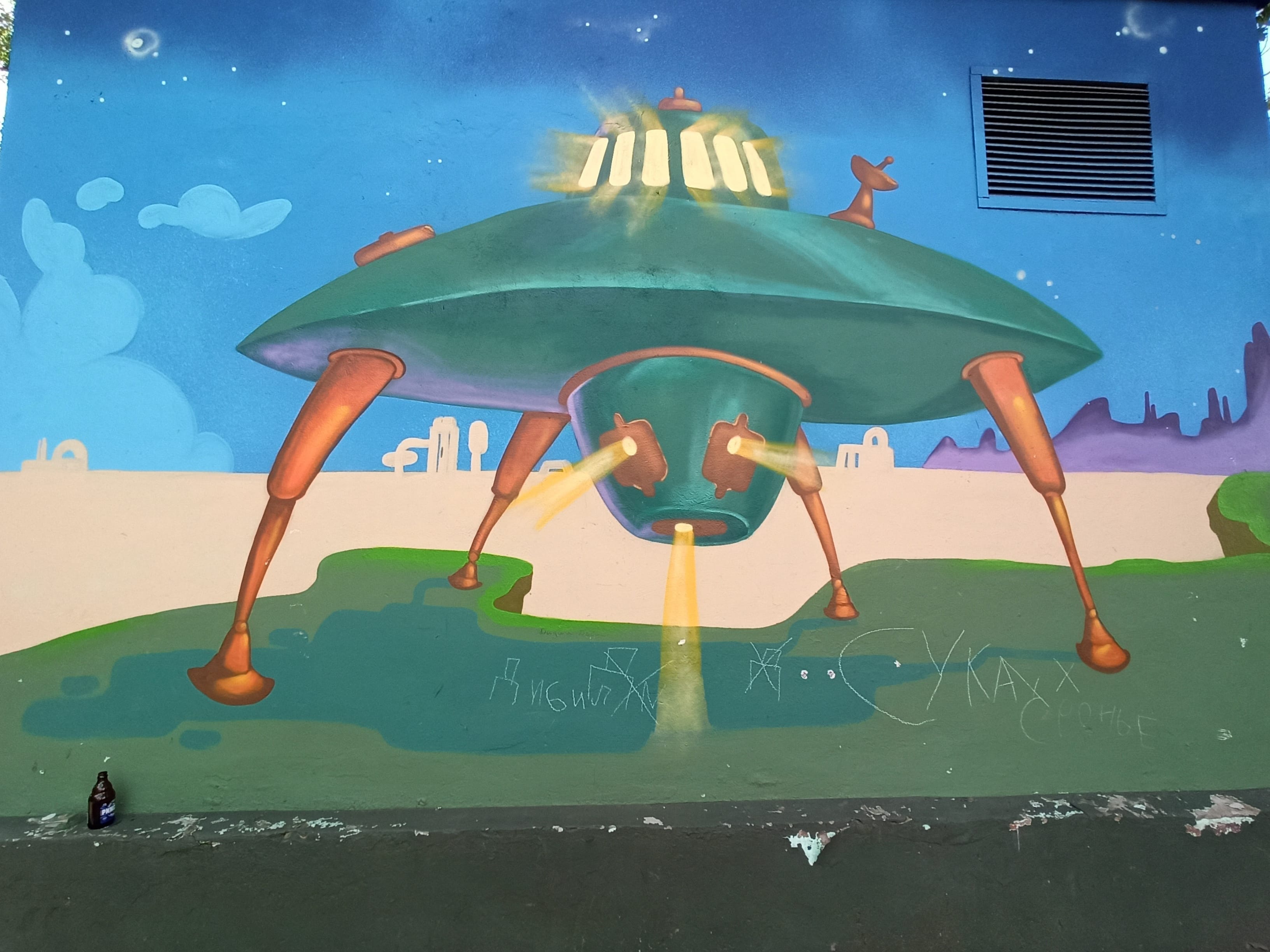 The artwork is of graffiti type. You can admire it in the city of Korolyov in Russia and more precisely here : Kalinina st. 2, 141070 Korolyov, Moscow region, Russia.