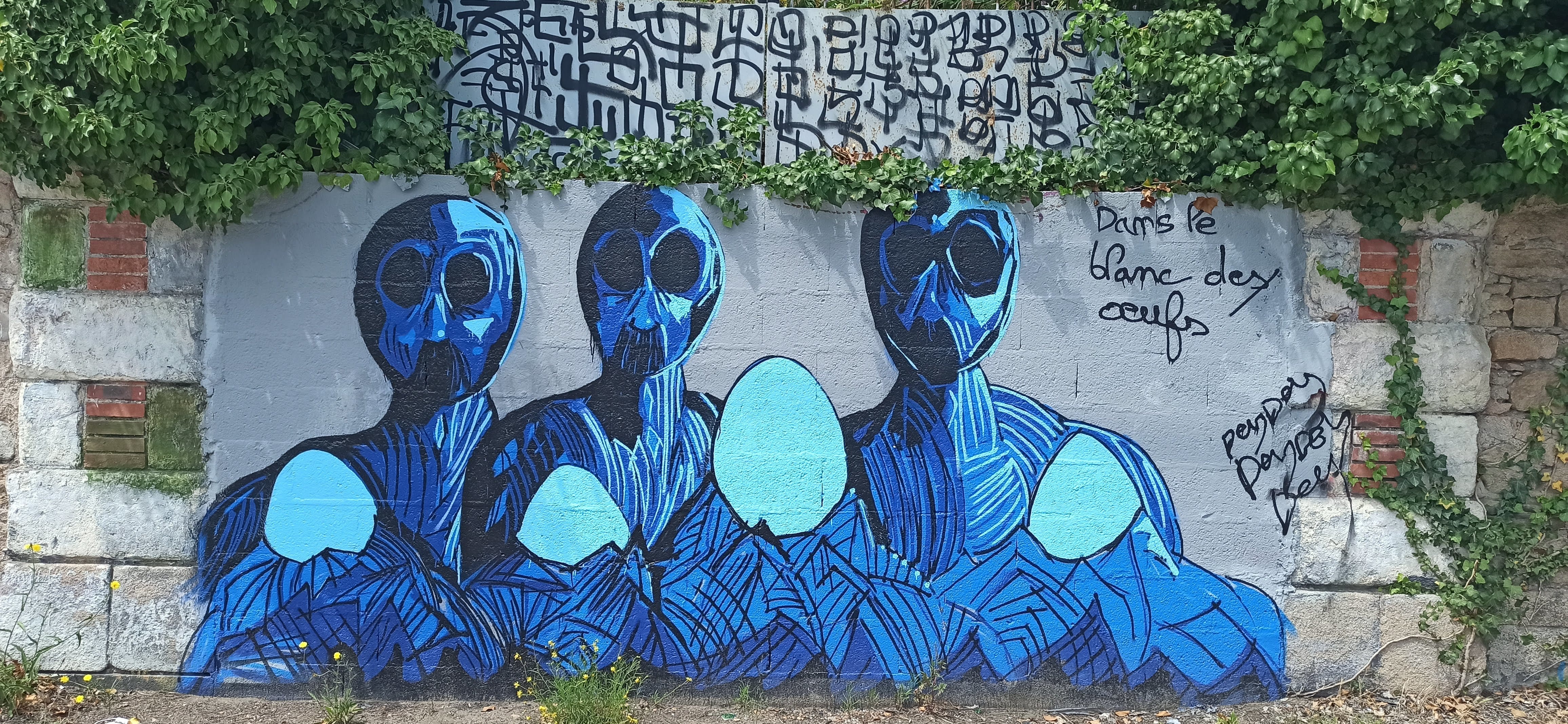 The artwork Dans le blanc des oeufs is of graffiti type. You can admire it in the city of Nantes in France and more precisely here : 30 Bd de Chantenay, 44100 Nantes, France.