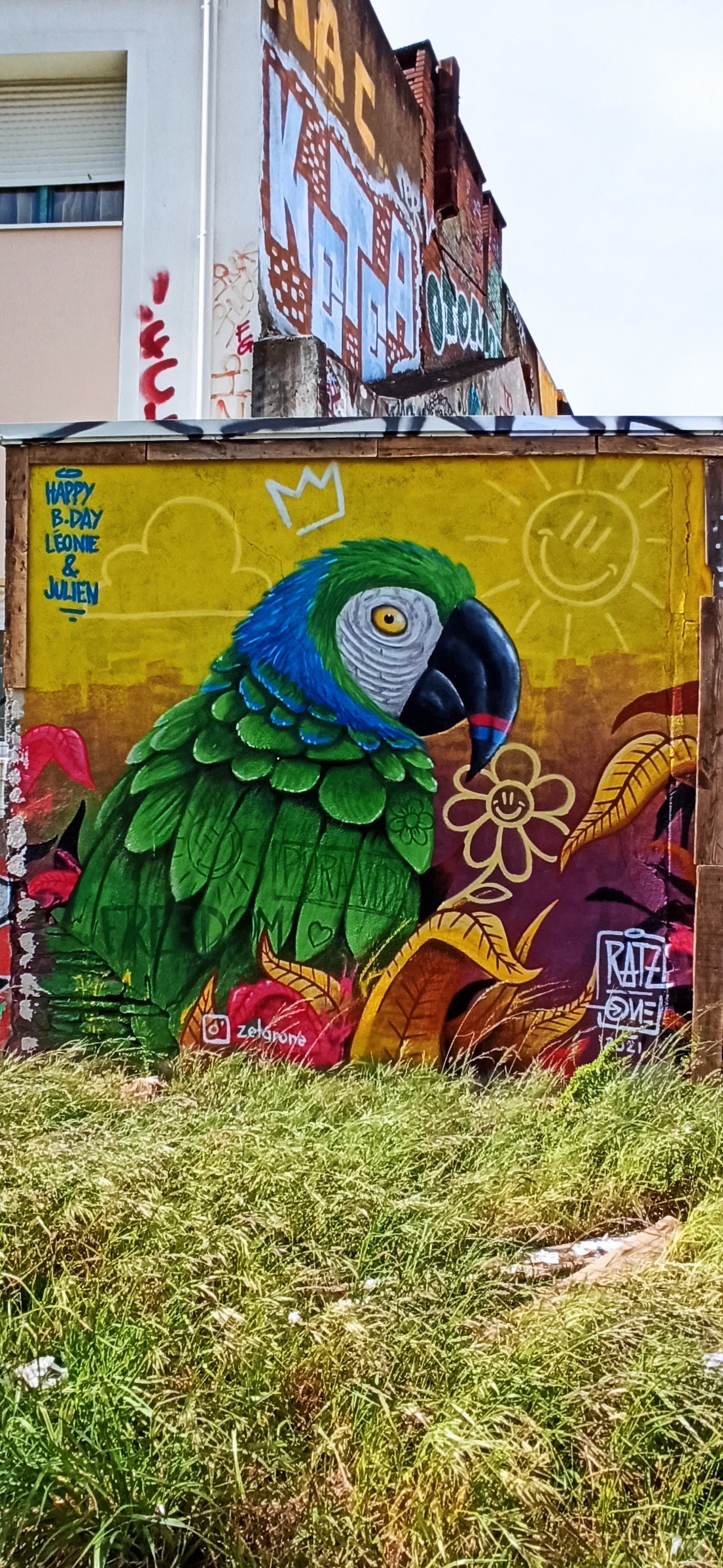 The artwork is of graffiti type. You can admire it in the city of Nantes in France and more precisely here : 17 Bd Babin Chevaye, 44200 Nantes, France.