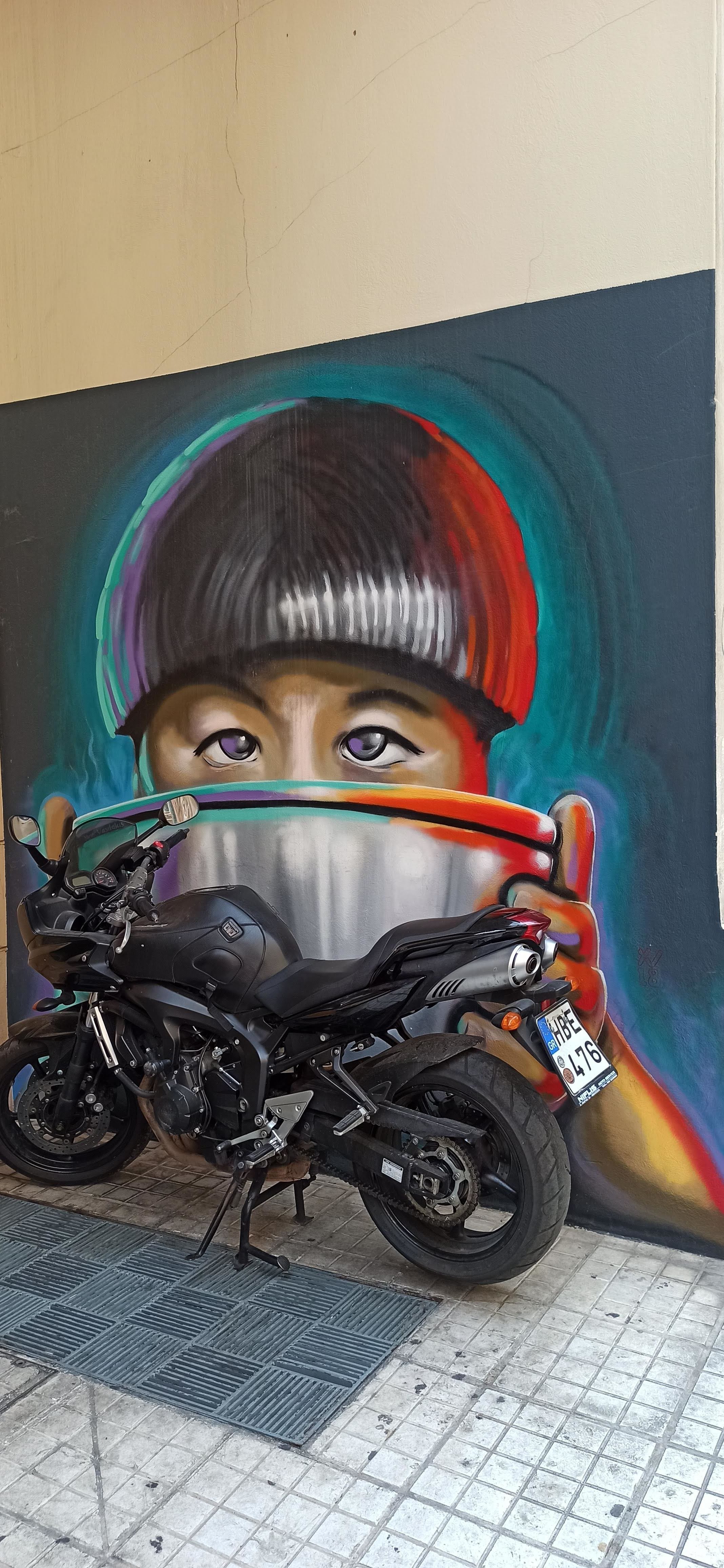 The artwork is of graffiti type. You can admire it in the city of Athina in Greece and more precisely here : Νίκης, Pl. Sintagmatos 11, Athina 105 57, Greece.