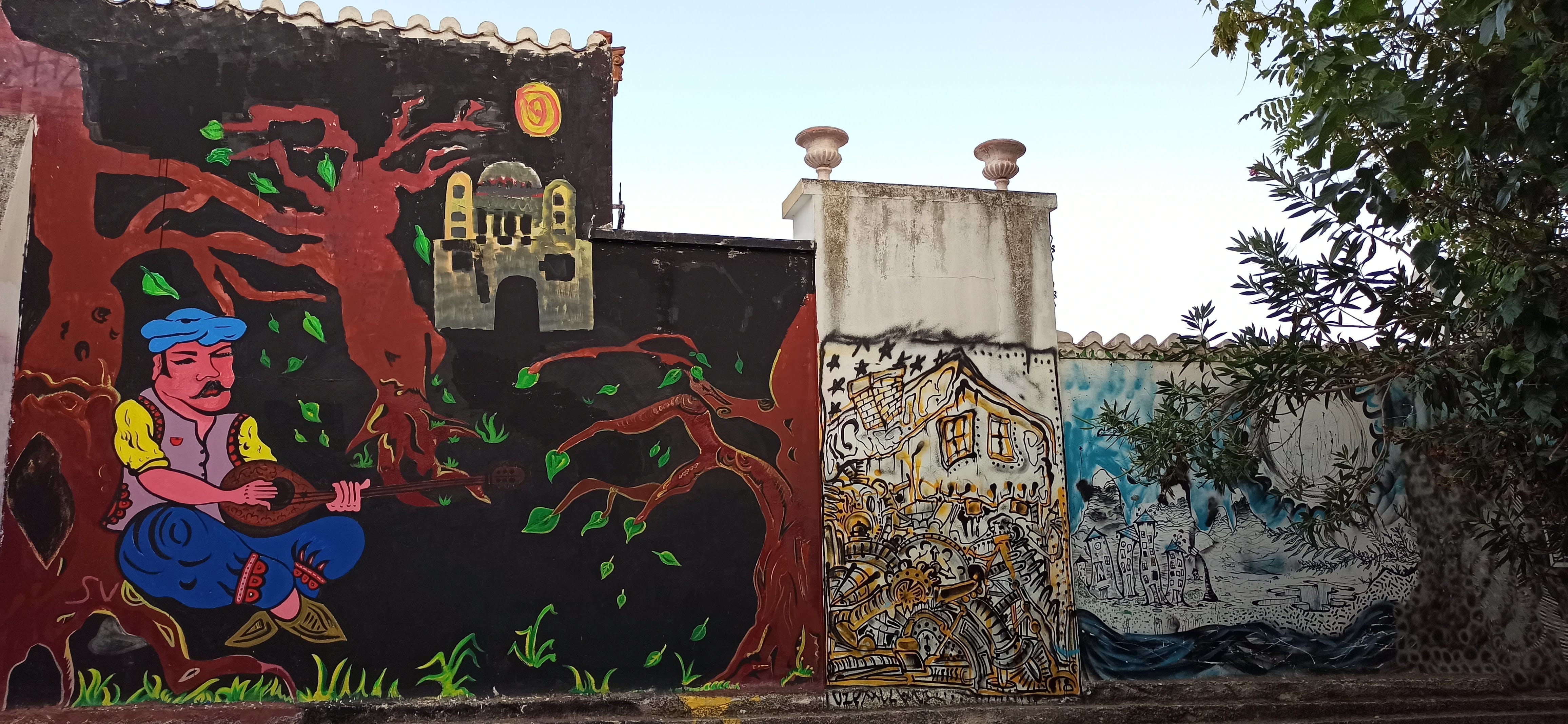 The artwork is of graffiti type. You can admire it in the city of Athina in Greece and more precisely here : Thespidos 16, Athina 105 58, Greece.