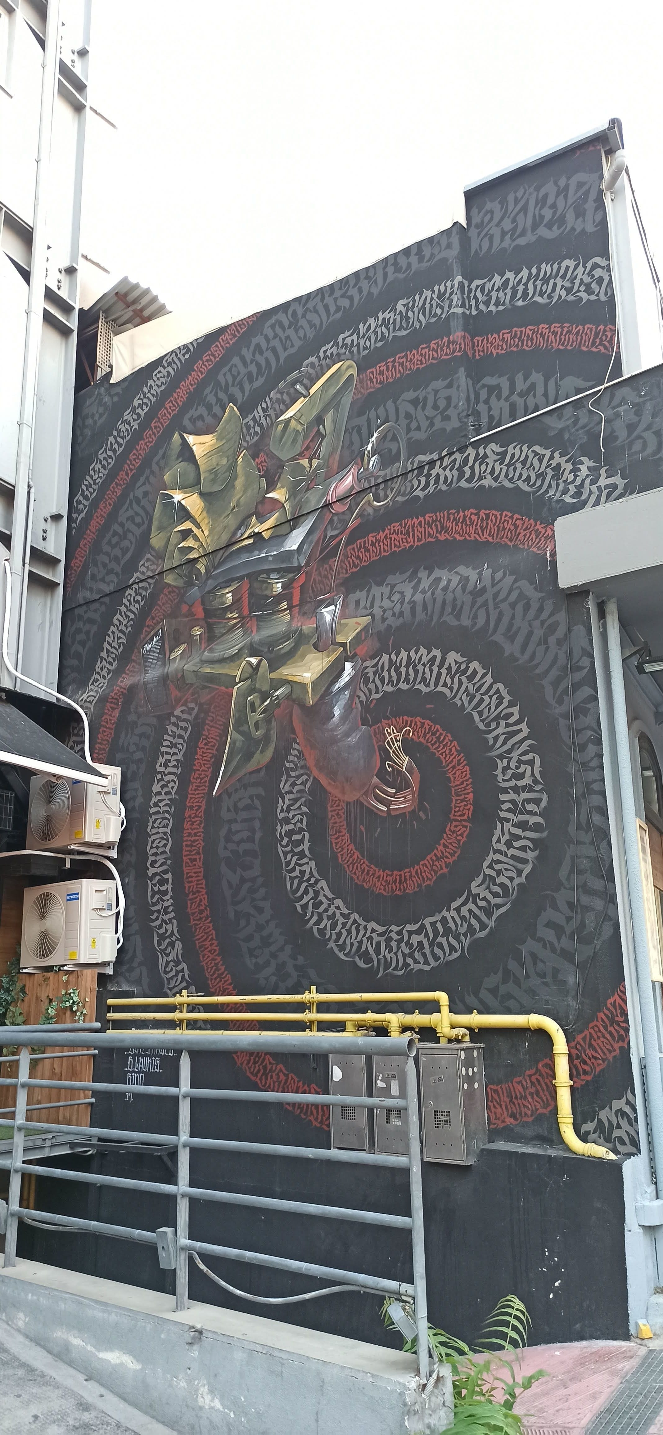 The artwork is of graffiti type. You can admire it in the city of Athina in Greece and more precisely here : Iakchou 24, Athina 118 54, Greece.