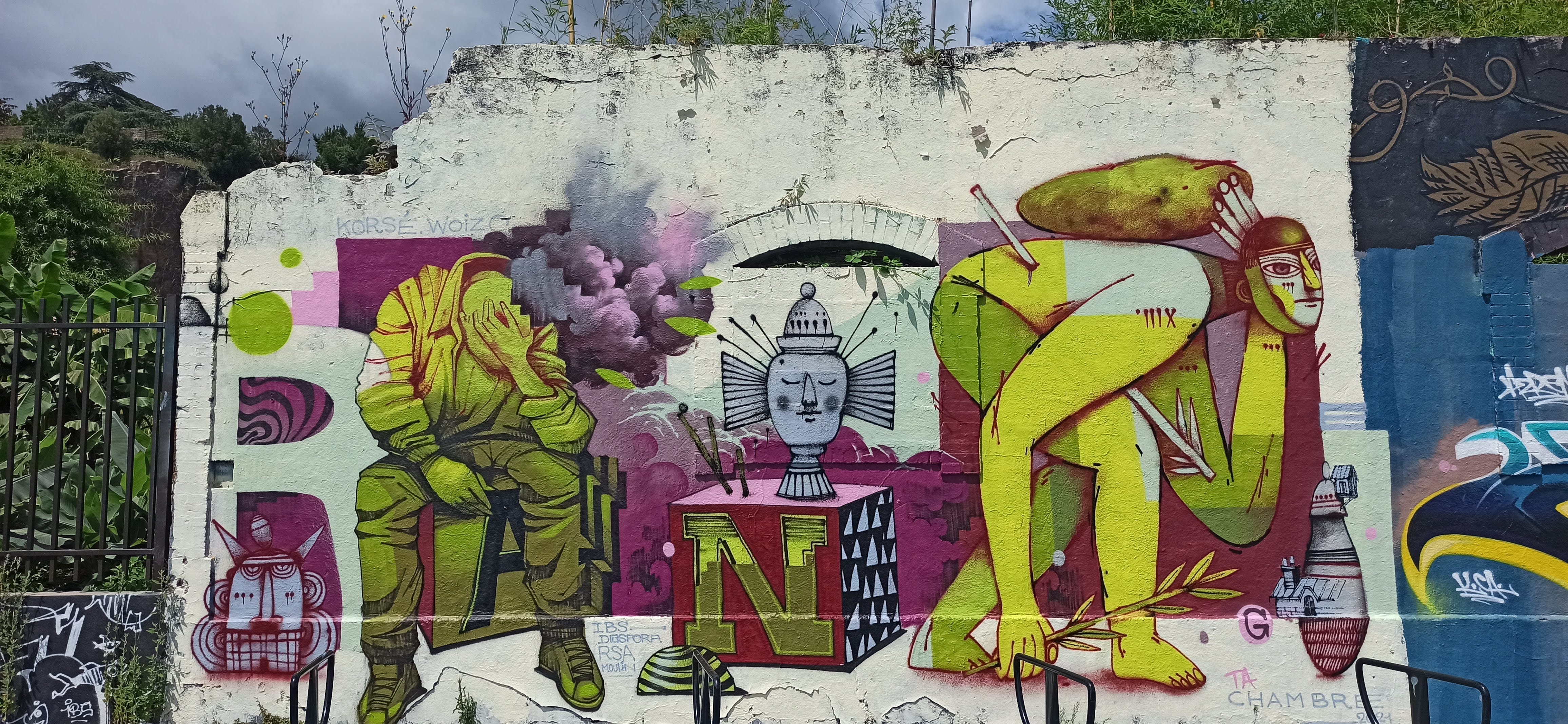 The artwork is of graffiti type. You can admire it in the city of Nantes in France and more precisely here : Carrière Misery, 44100 Nantes, France.
