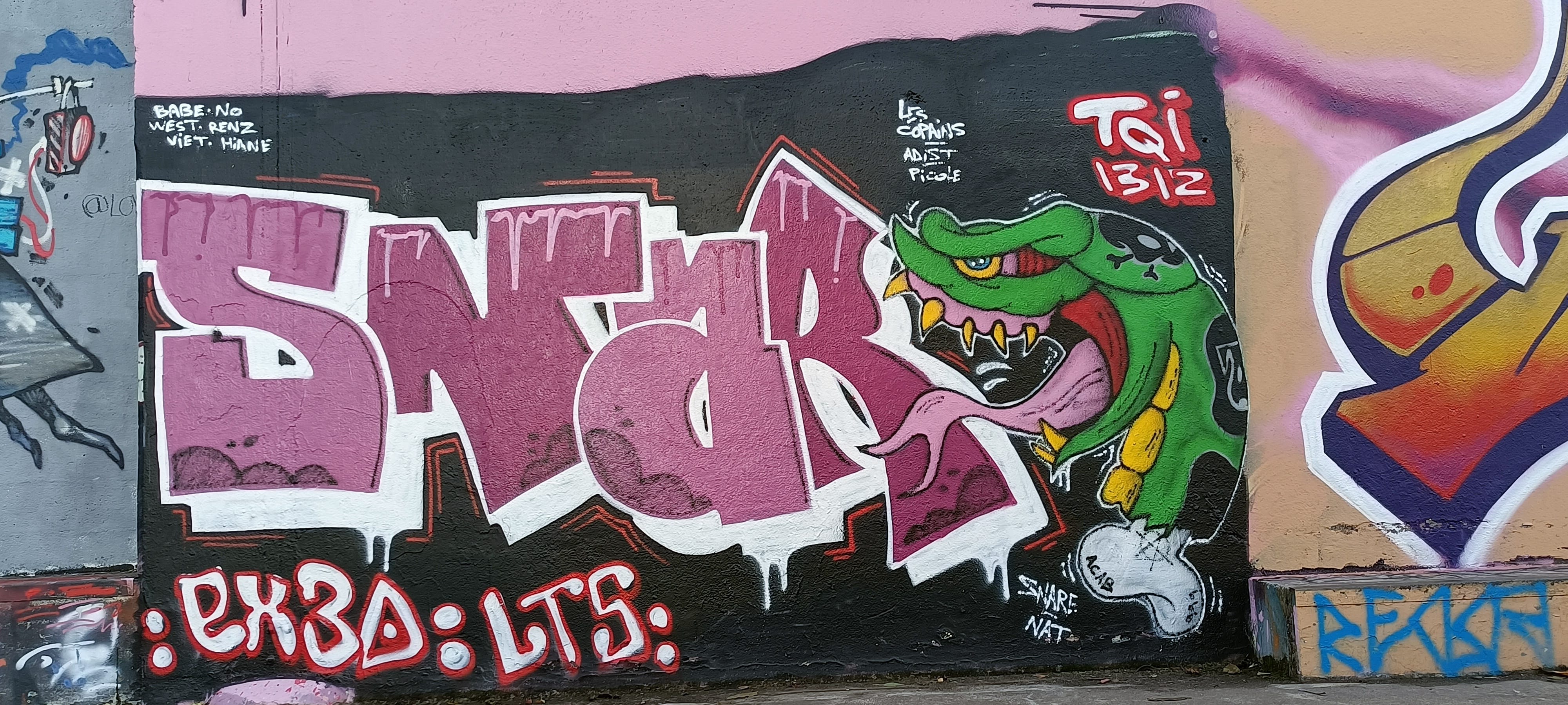 The artwork is of graffiti type. You can admire it in the city of Nantes in France and more precisely here : 1 Bd Babin Chevaye, 44200 Nantes, France.