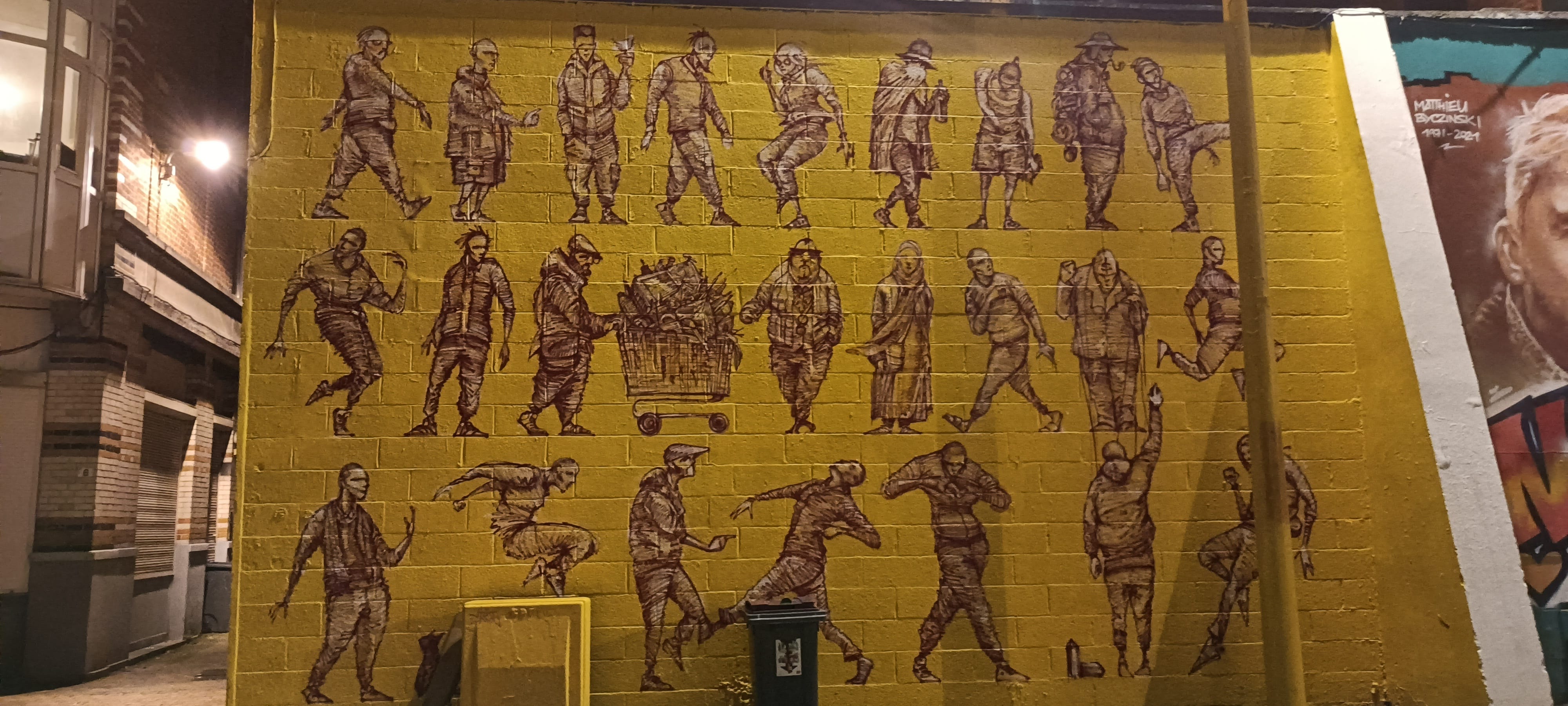 The artwork is of graffiti type. You can admire it in the city of Lille in France and more precisely here : 2bis Cr Bonté, 59000 Lille, France.