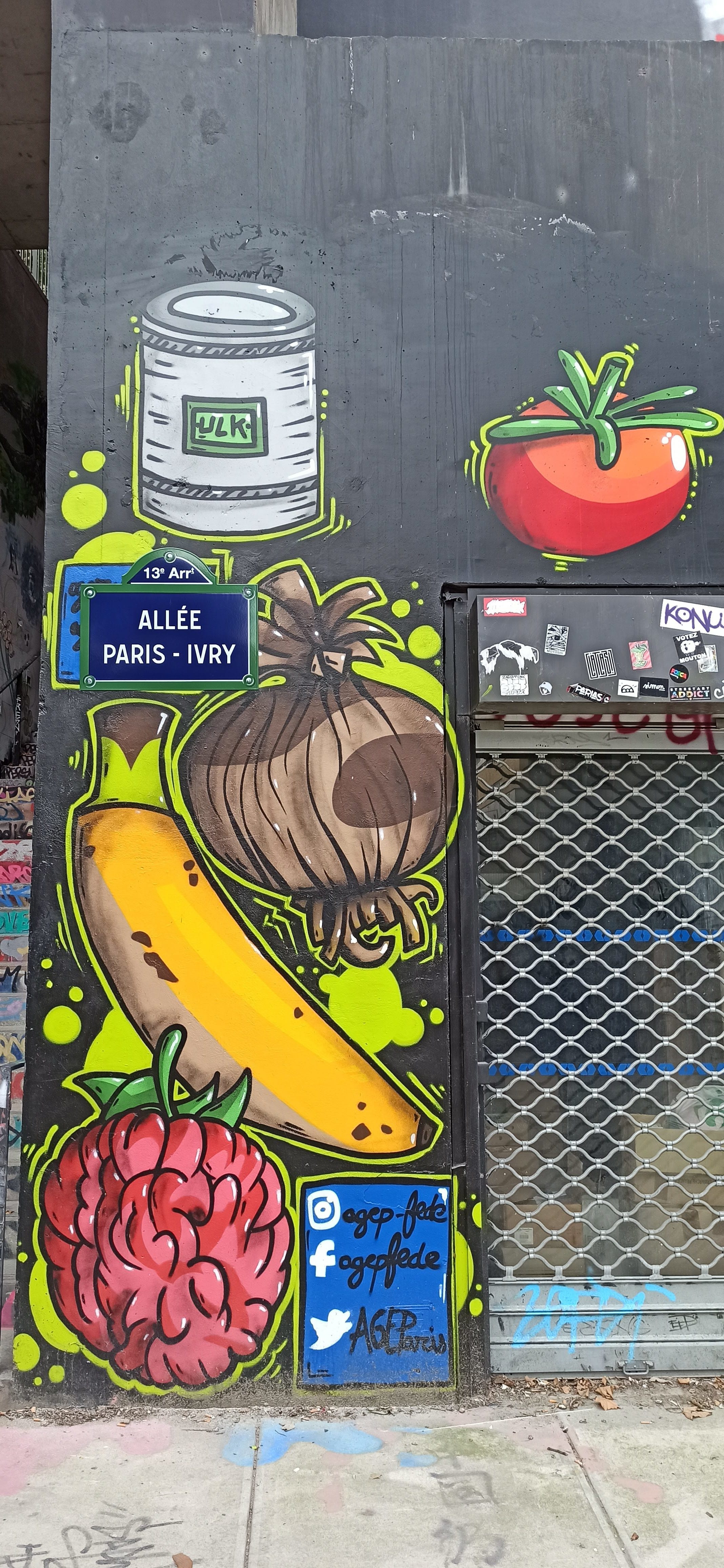The artwork is of graffiti type. You can admire it in the city of Paris in France and more precisely here : 3 All. Paris-Ivry, 75013 Paris, France.