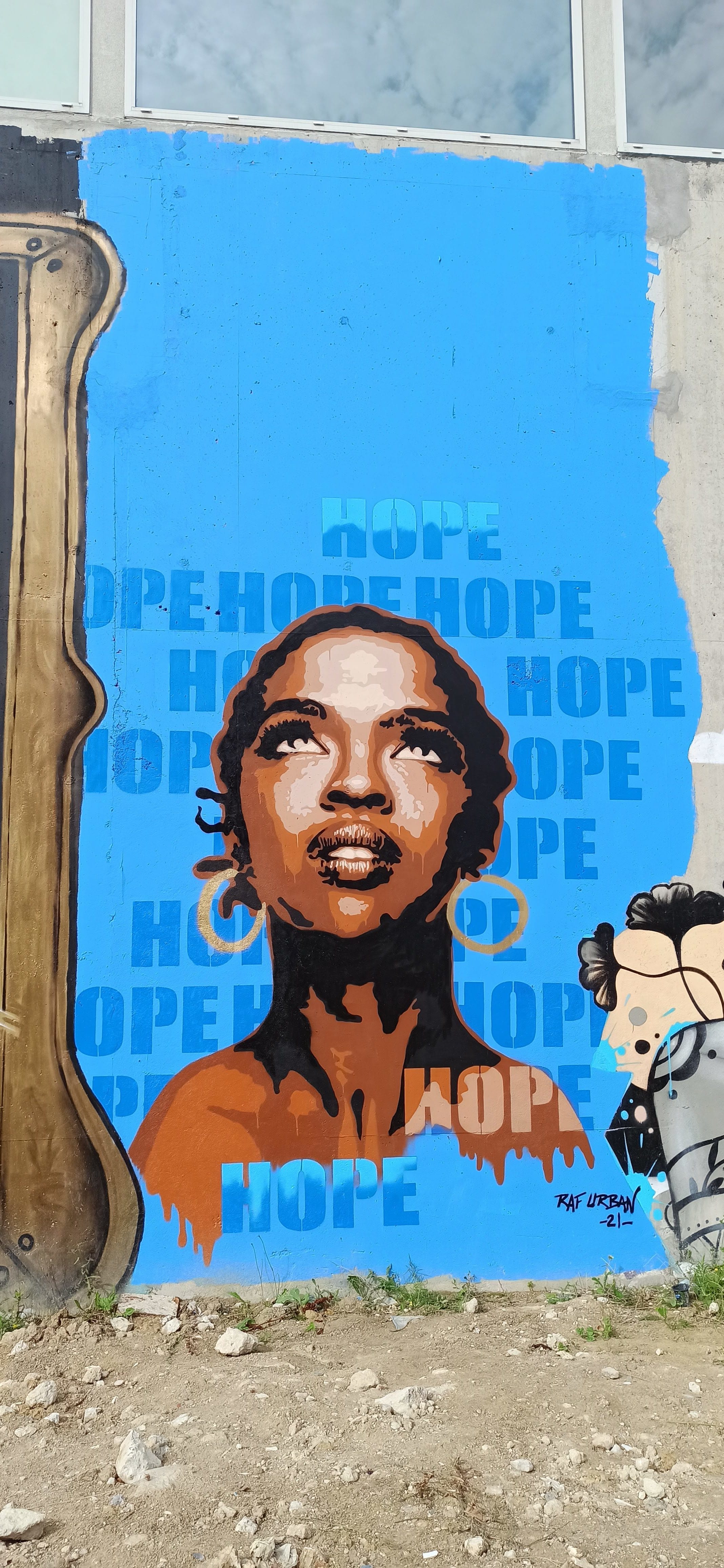 The artwork Hope is of graffiti type. You can admire it in the city of Paris in France and more precisely here : 2 Rue Jean-Baptiste Berlier, 75013 Paris, France.