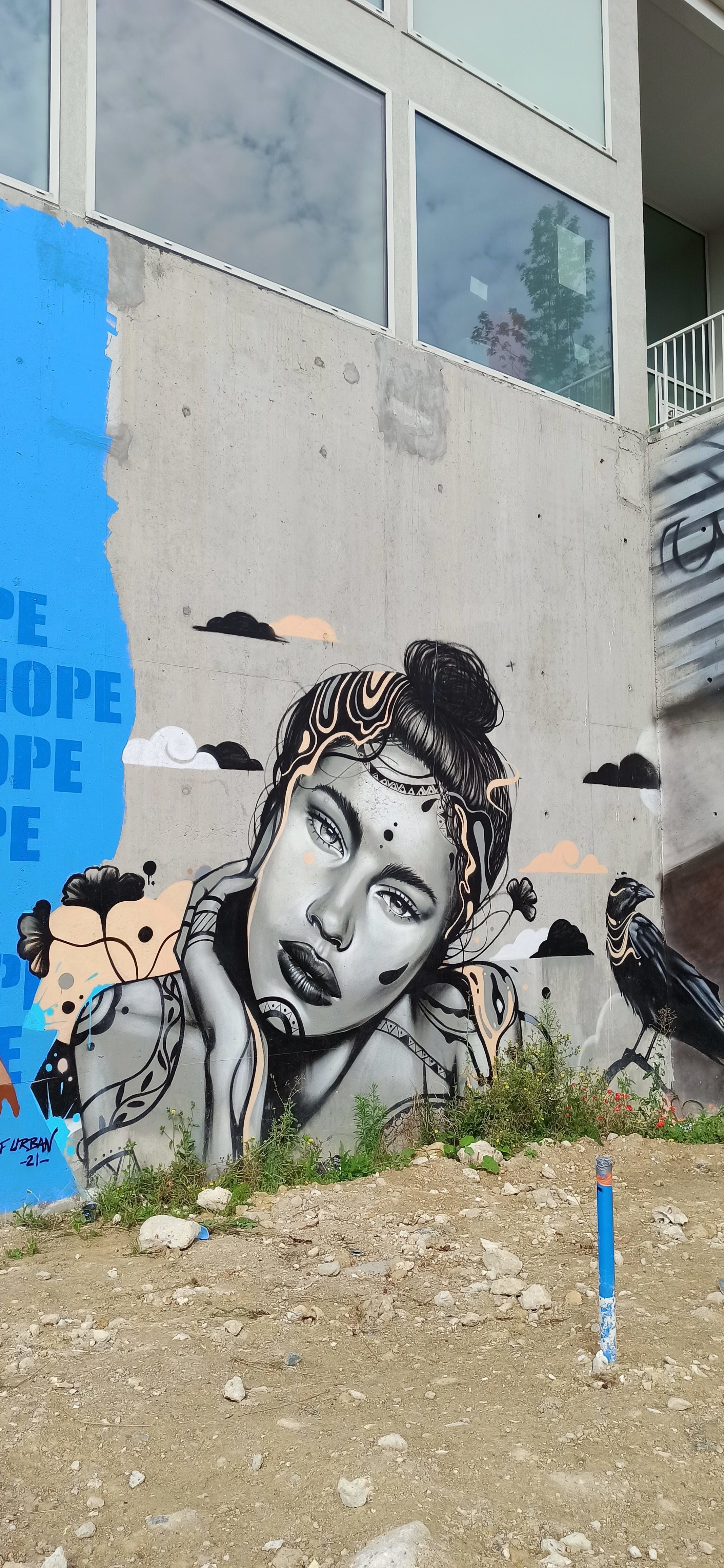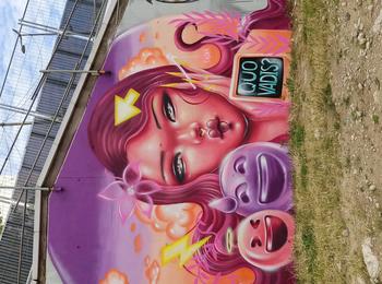 The artwork is of graffiti type. You can admire it in the city of Paris in France and more precisely here : 2 Rue Jean-Baptiste Berlier, 75013 Paris, France.