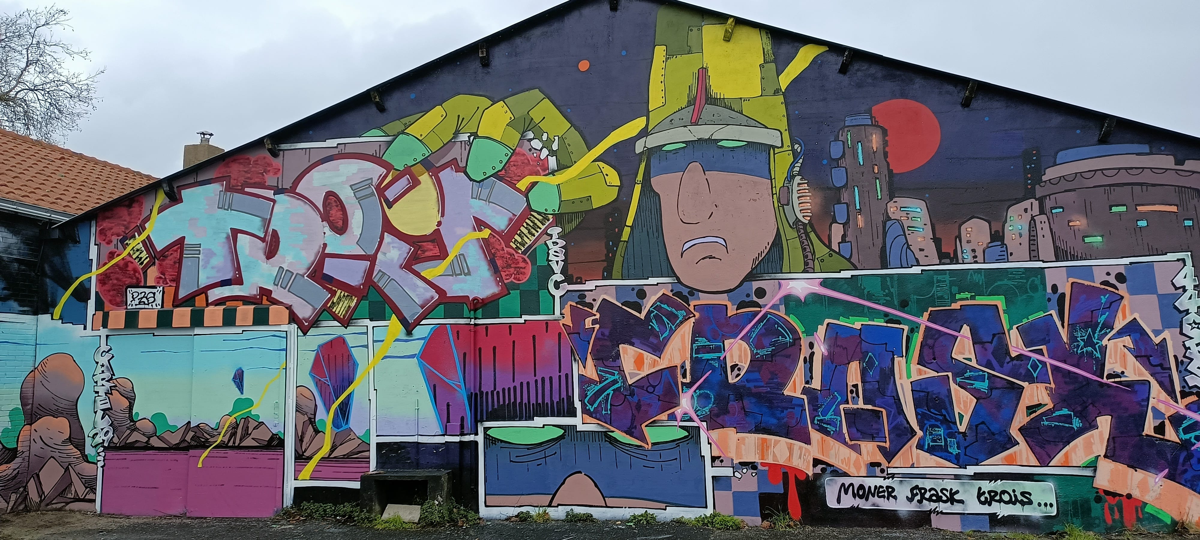The artwork is of graffiti type. You can admire it in the city of Nantes in France and more precisely here : Unnamed Road, 44200, Nantes, France.