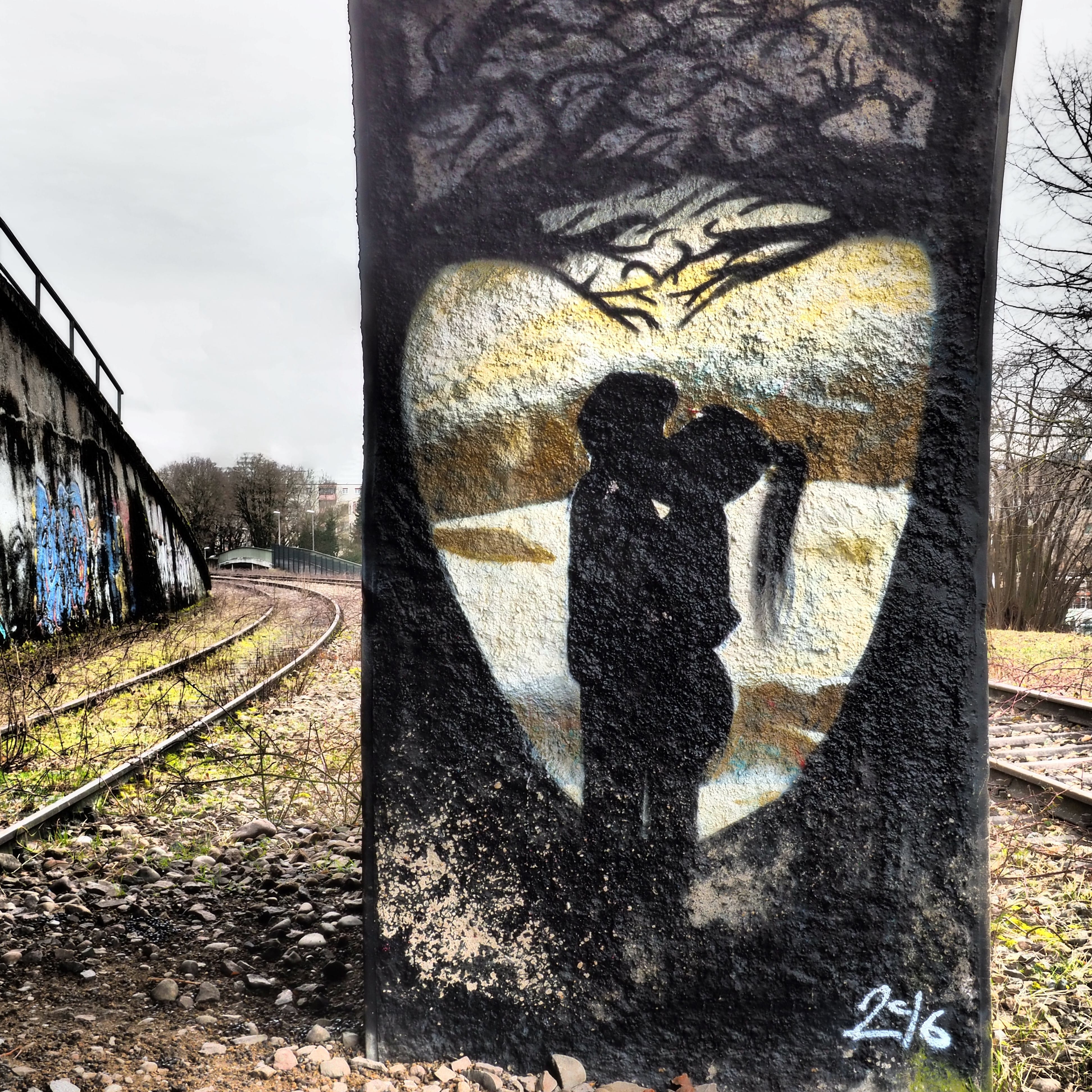 The artwork first love is of graffiti type. You can admire it in the city of Basel in Schweiz and more precisely here : Bahndamm Gotenwegli.