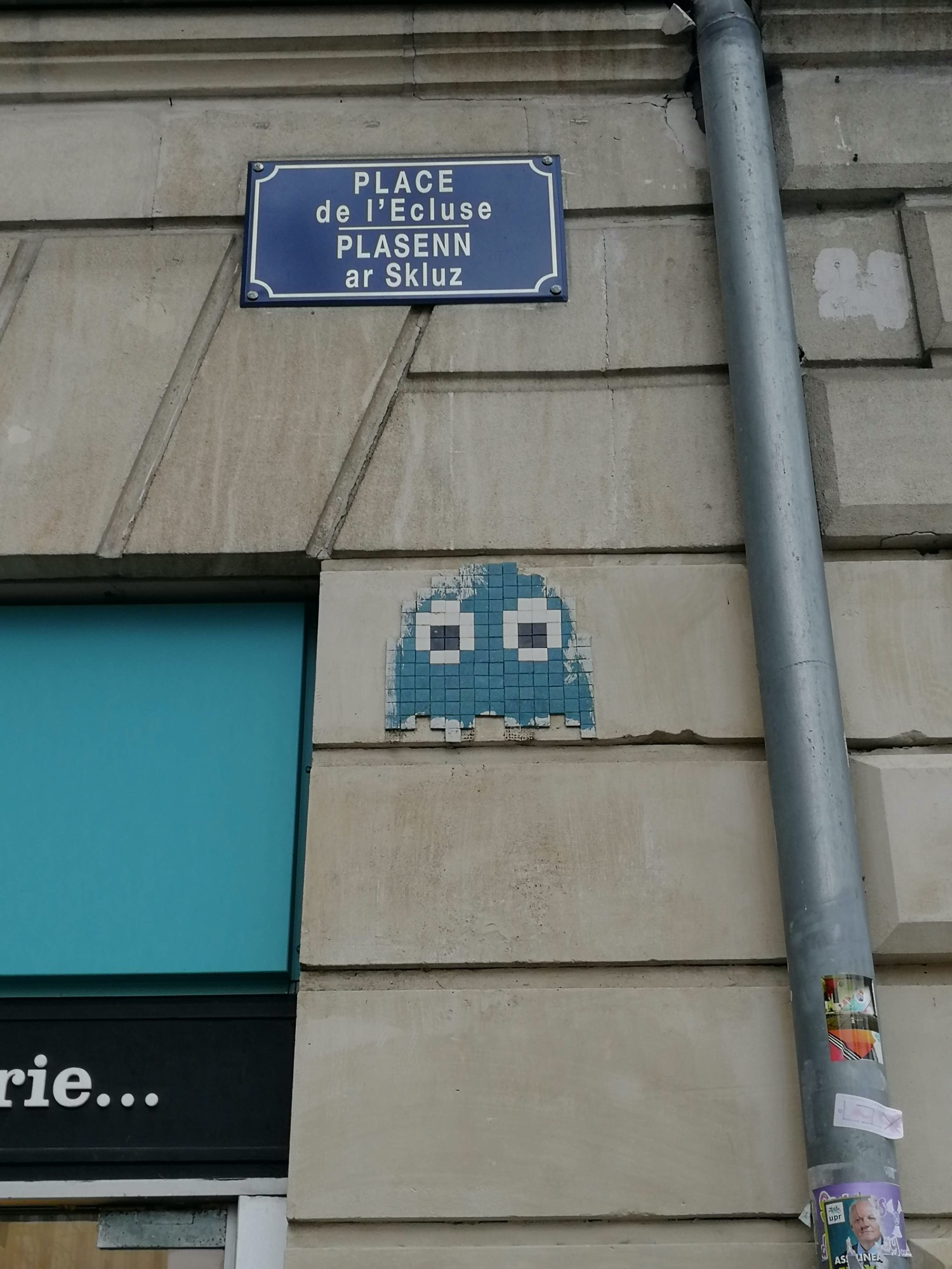 The artwork is of mosaic type. You can admire it in the city of Nantes in France and more precisely here : 22 Rue des Halles, 44000 Nantes, France.
