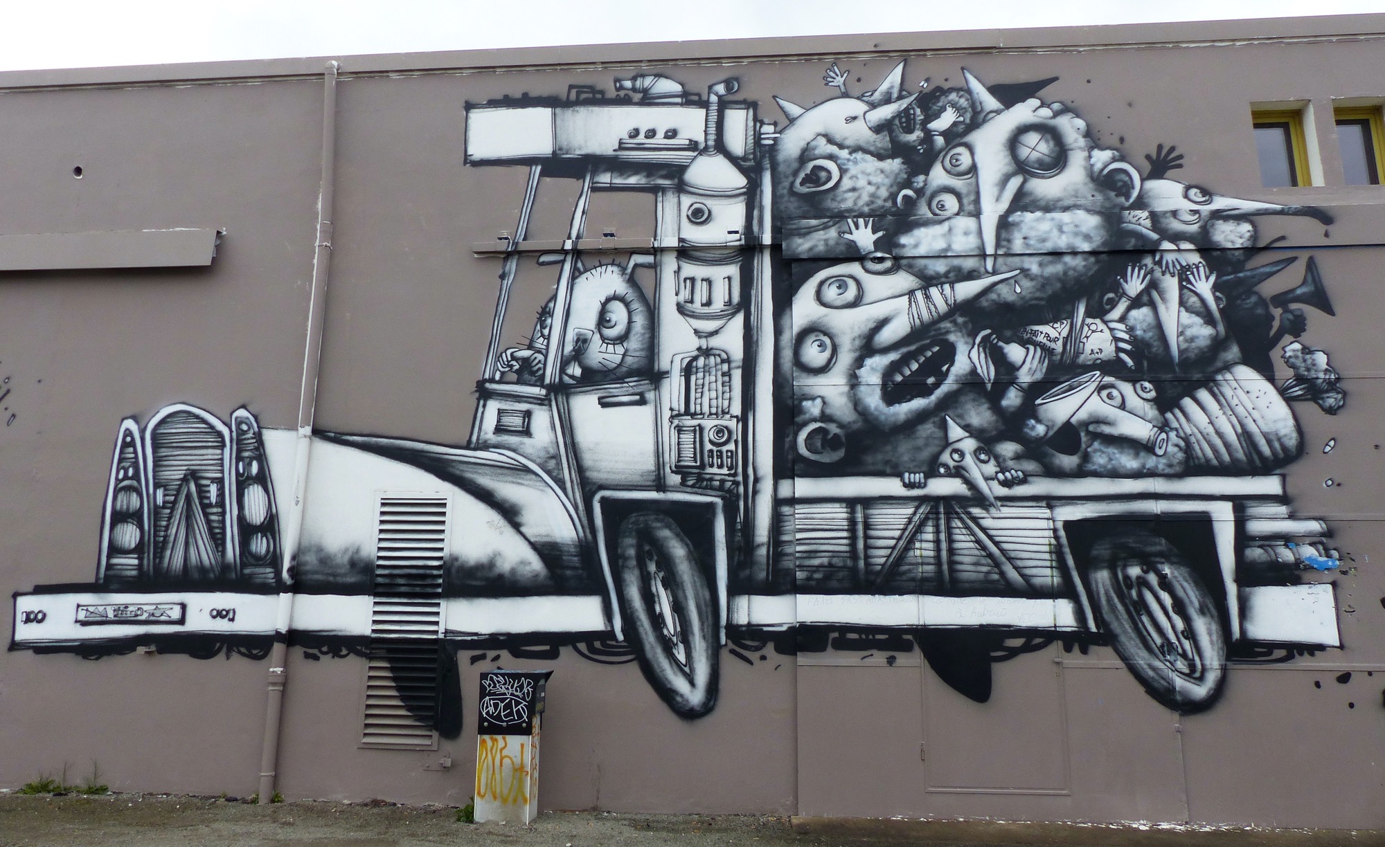 The artwork is of graffiti type. You can admire it in the city of Nantes in France and more precisely here : Quai Marquis d'Aiguillon, 44100 Nantes, France.