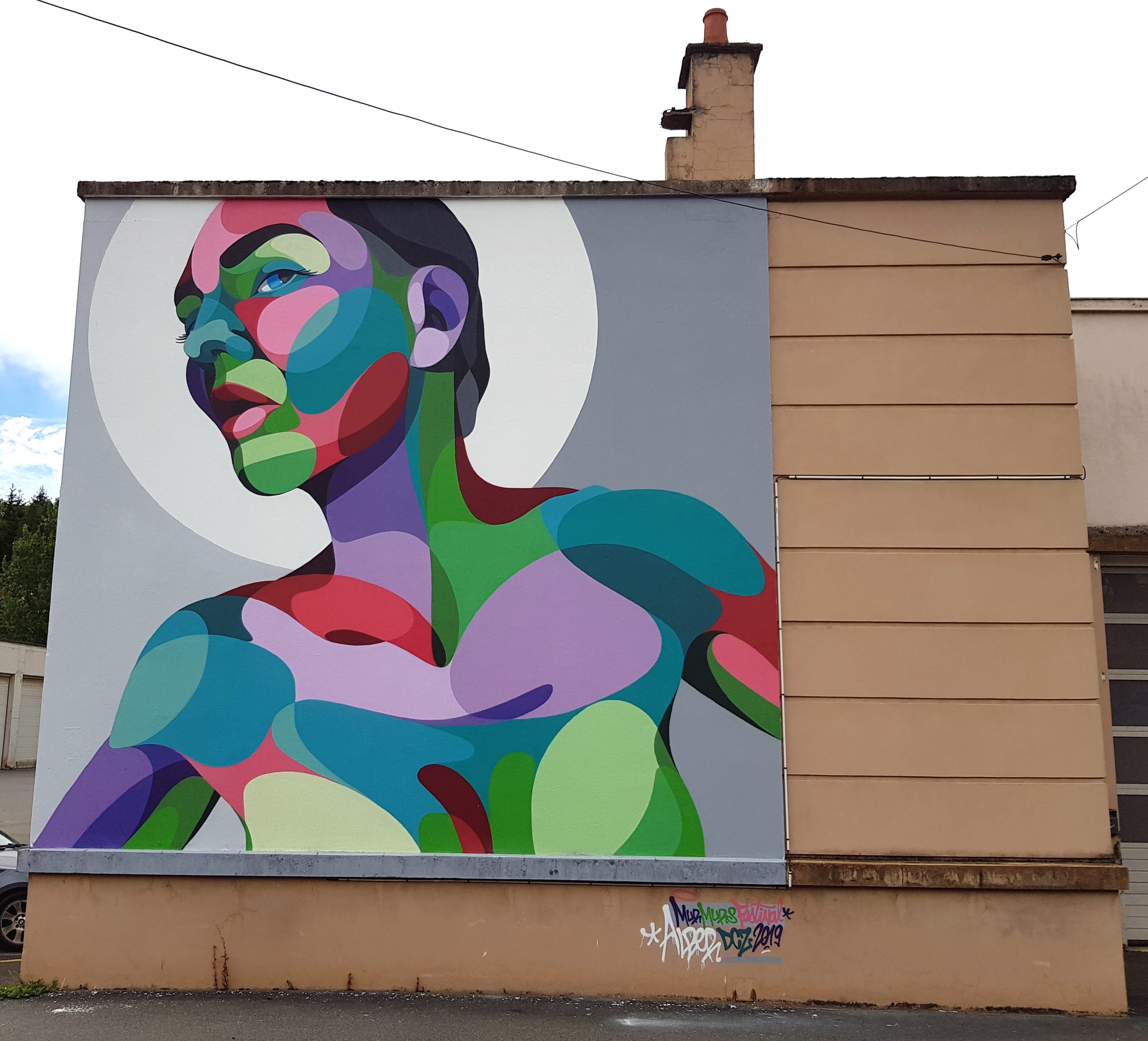 The artwork is of graffiti type. You can admire it in the city of Decazeville in France and more precisely here : 230 Rue Edmond Sautet, 12300 Decazeville, France.