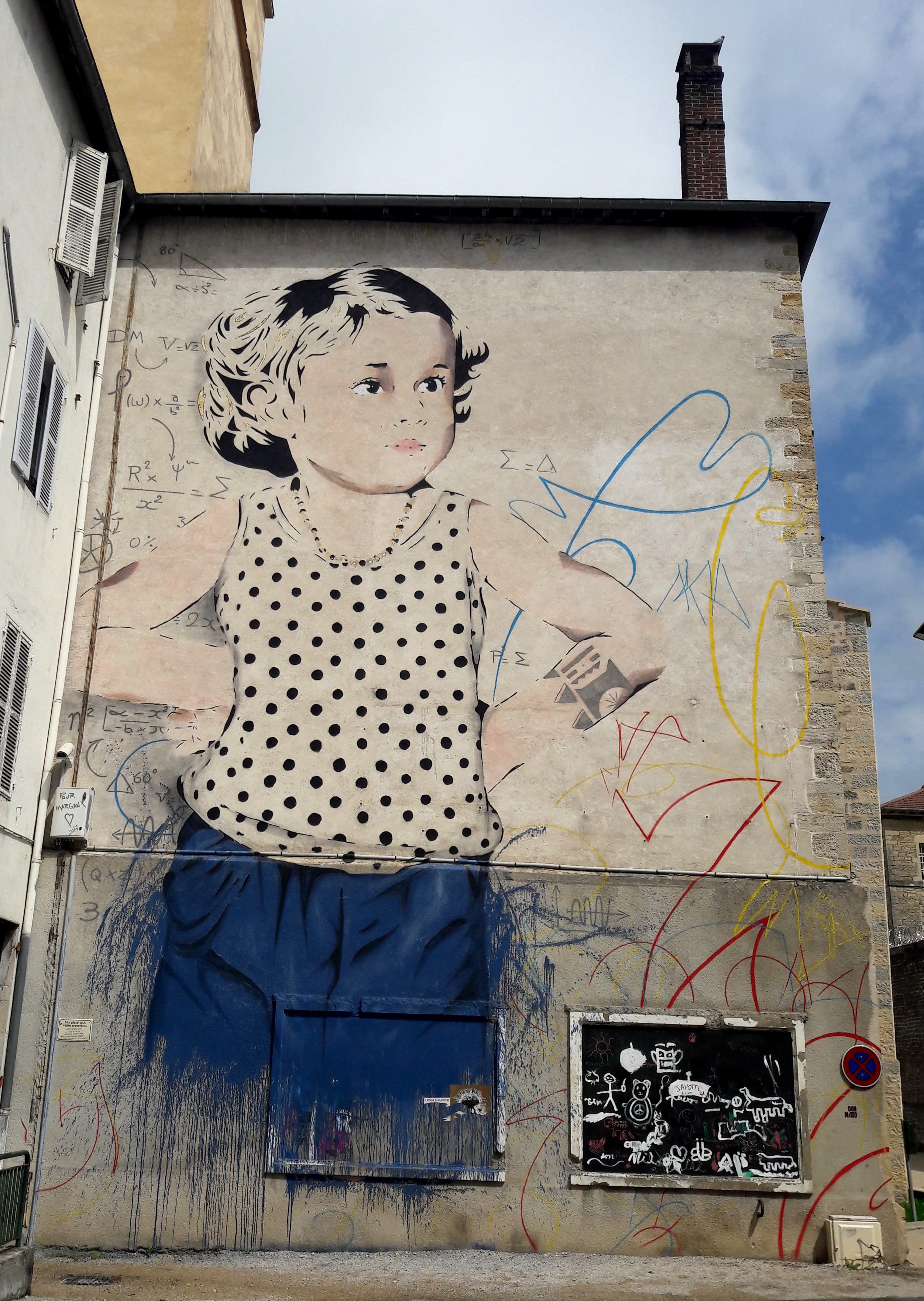 The artwork is of graffiti type. You can admire it in the city of Lons-le-Saunier in France and more precisely here : 9 Rue Pasteur, 39000 Lons-le-Saunier, France.