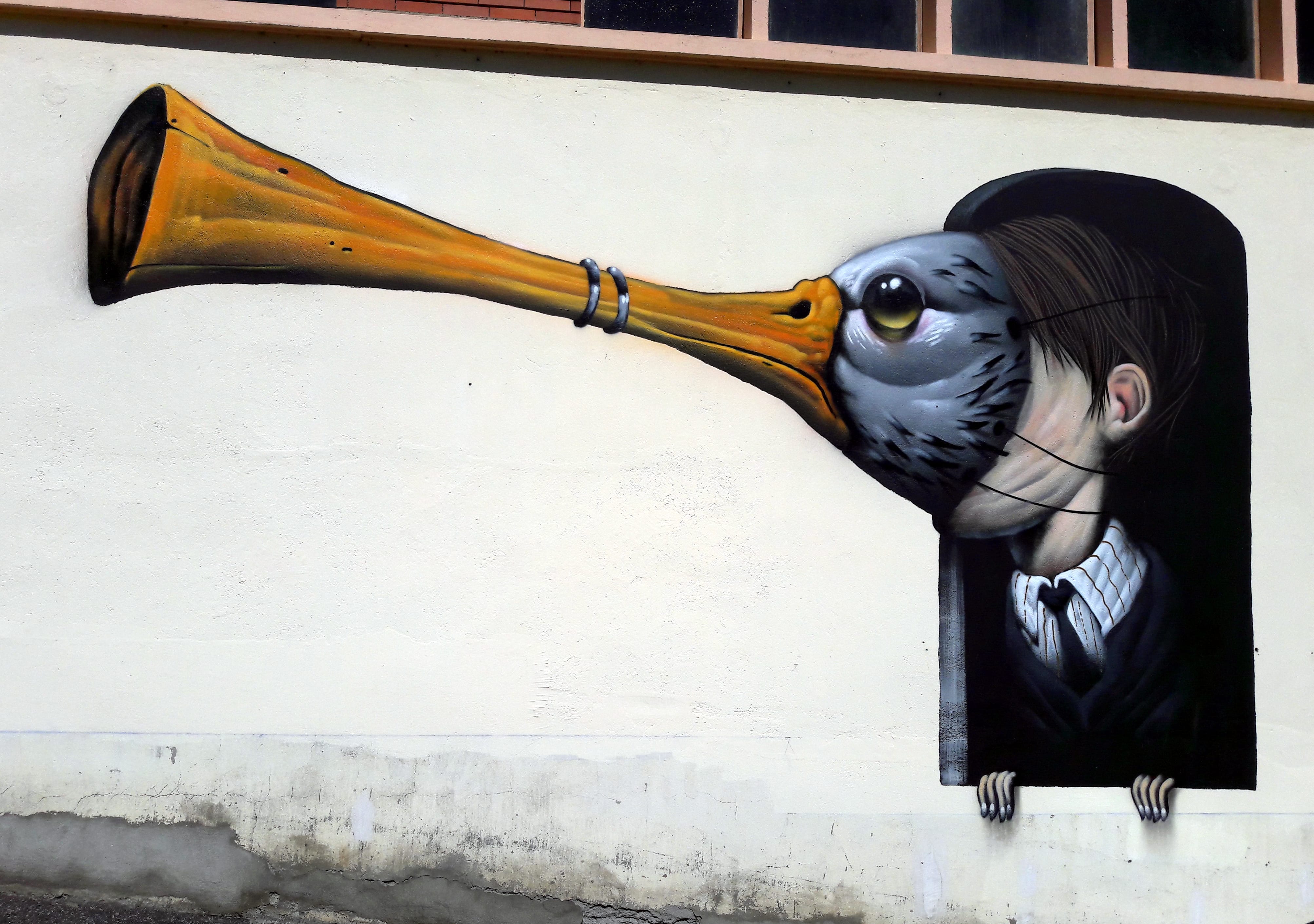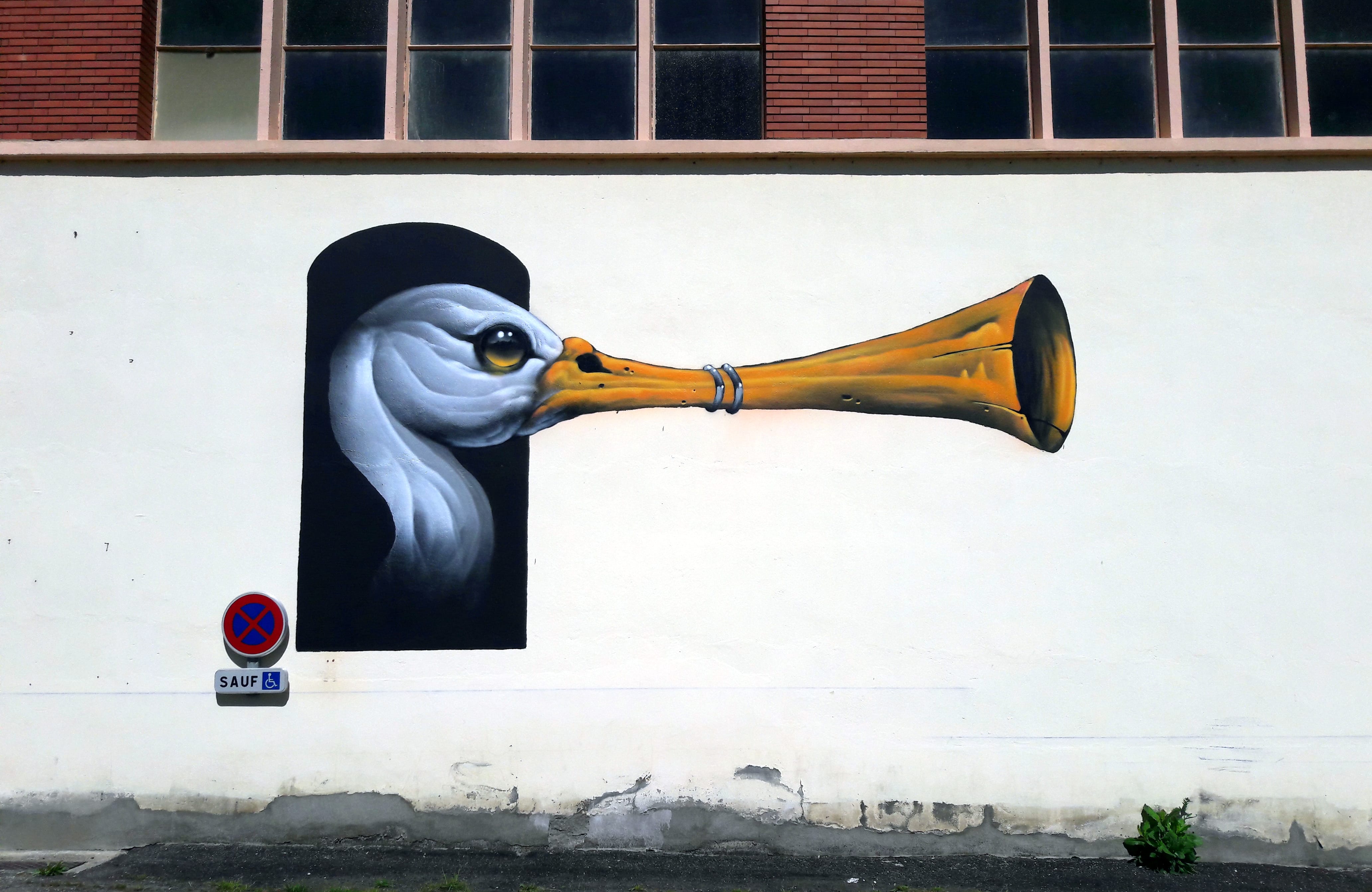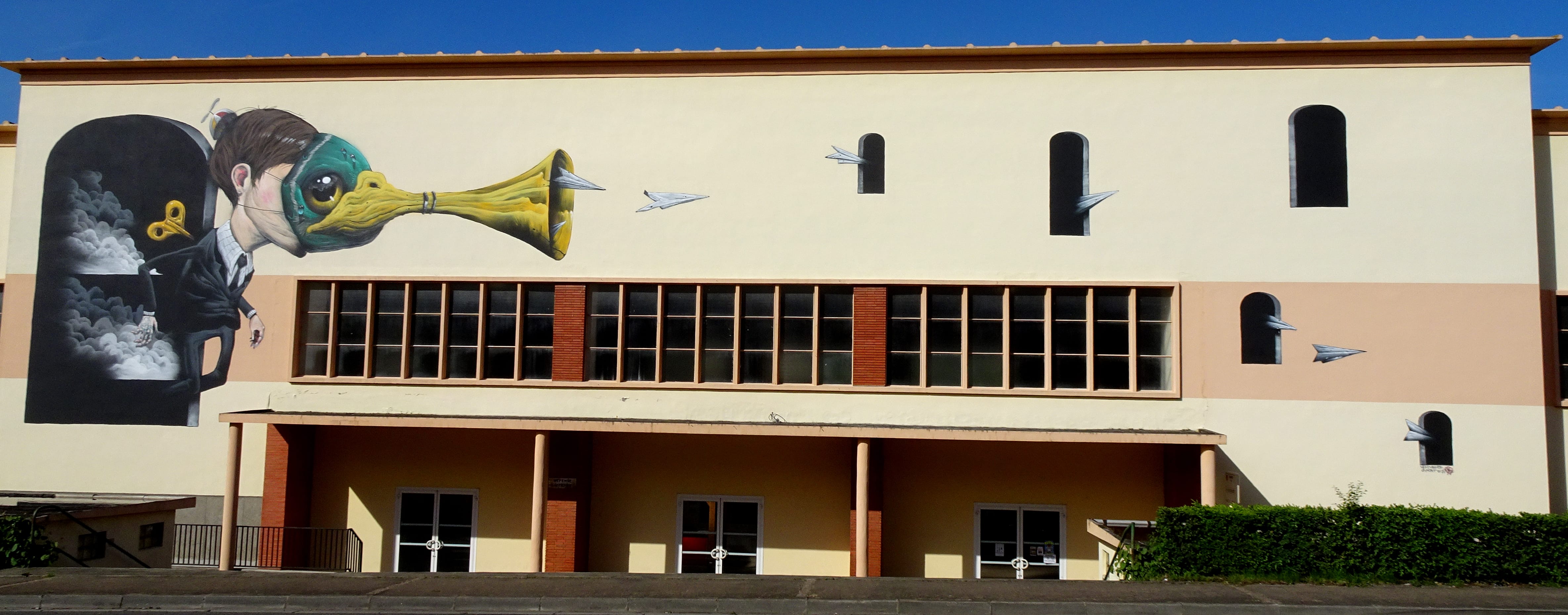 The artwork is of graffiti type. You can admire it in the city of Gimont in France and more precisely here : Halle au Gras, 32200 Gimont, France.
