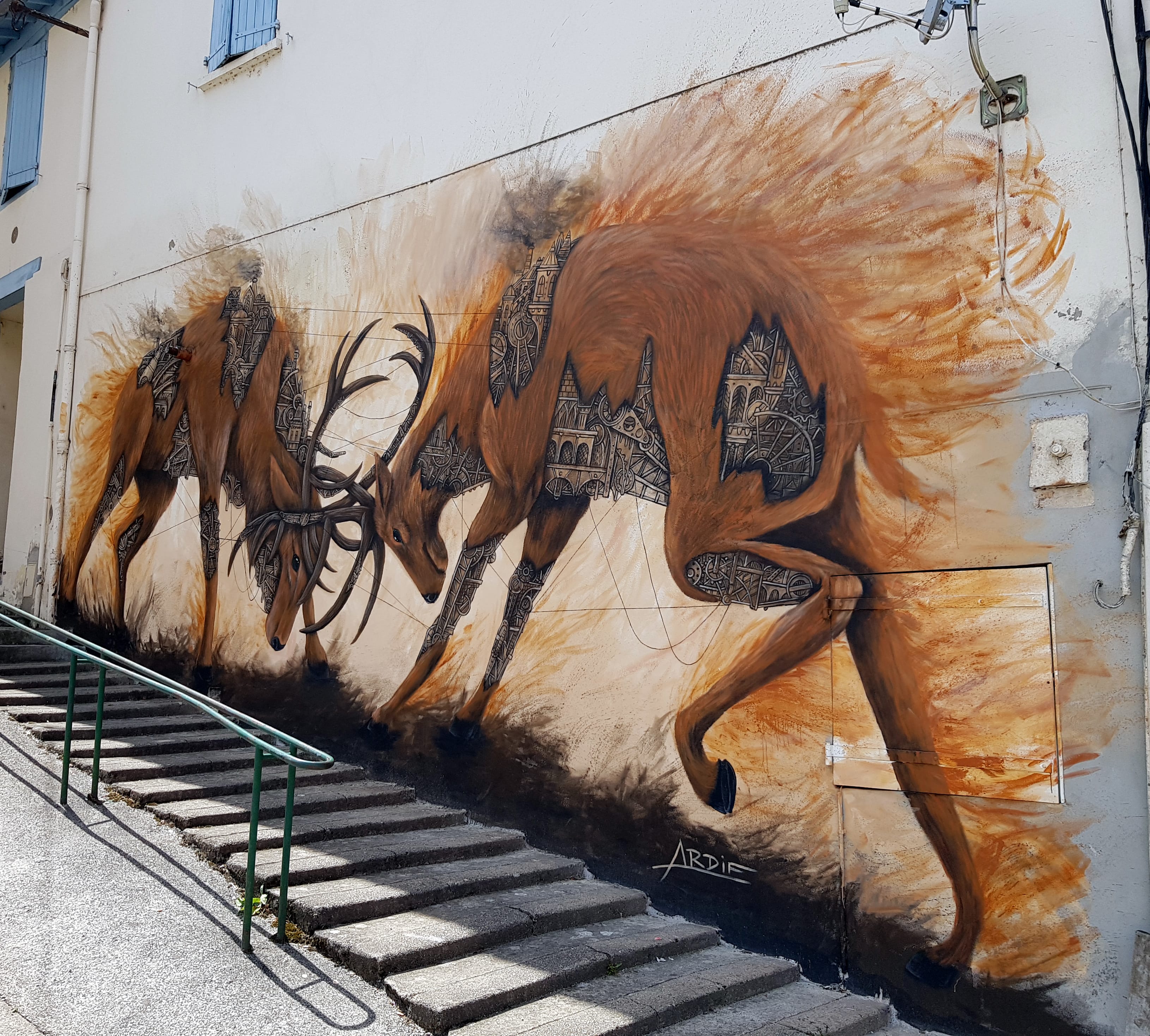 The artwork is of graffiti type. You can admire it in the city of Decazeville in France and more precisely here : 4 Rue Emma Calve, 12300 Decazeville, France.