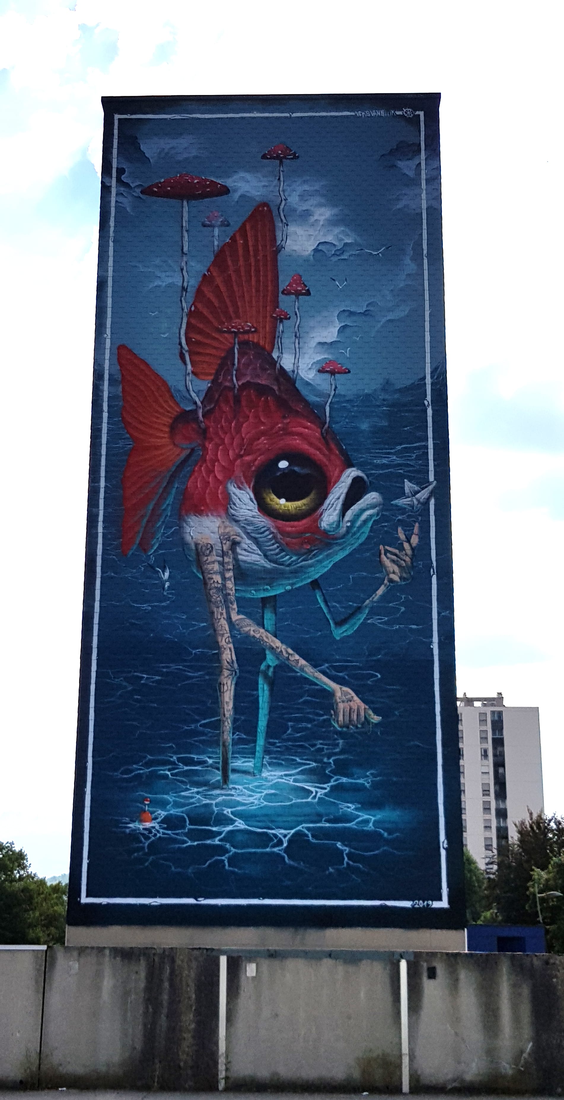 The artwork is of graffiti type. You can admire it in the city of Le Pont-de-Claix in France and more precisely here : 21 All. Albert Camus, 38800 Le Pont-de-Claix, France.