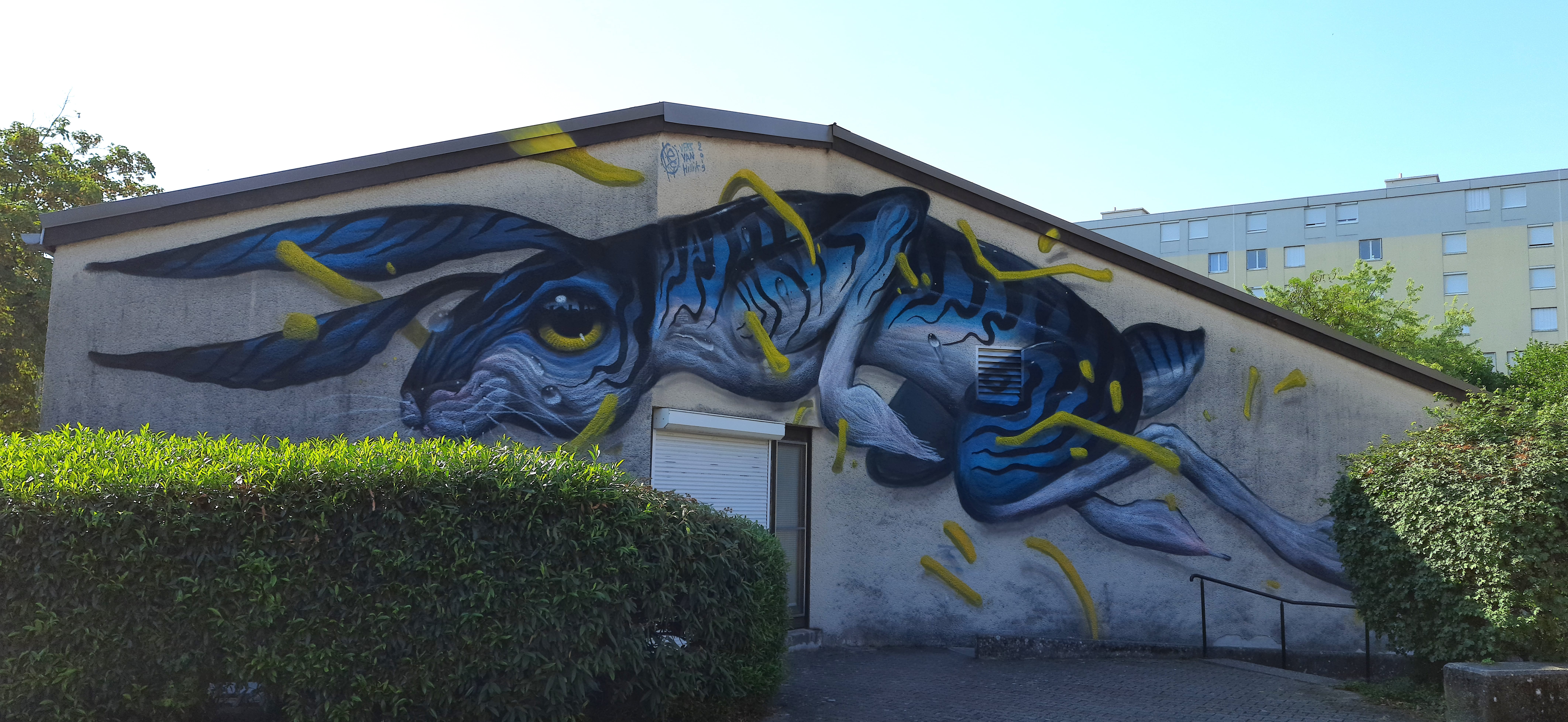 The artwork is of graffiti type. You can admire it in the city of Le Pont-de-Claix in France and more precisely here : place Michel Couëtoux, 38800 Le Pont-de-Claix, France.