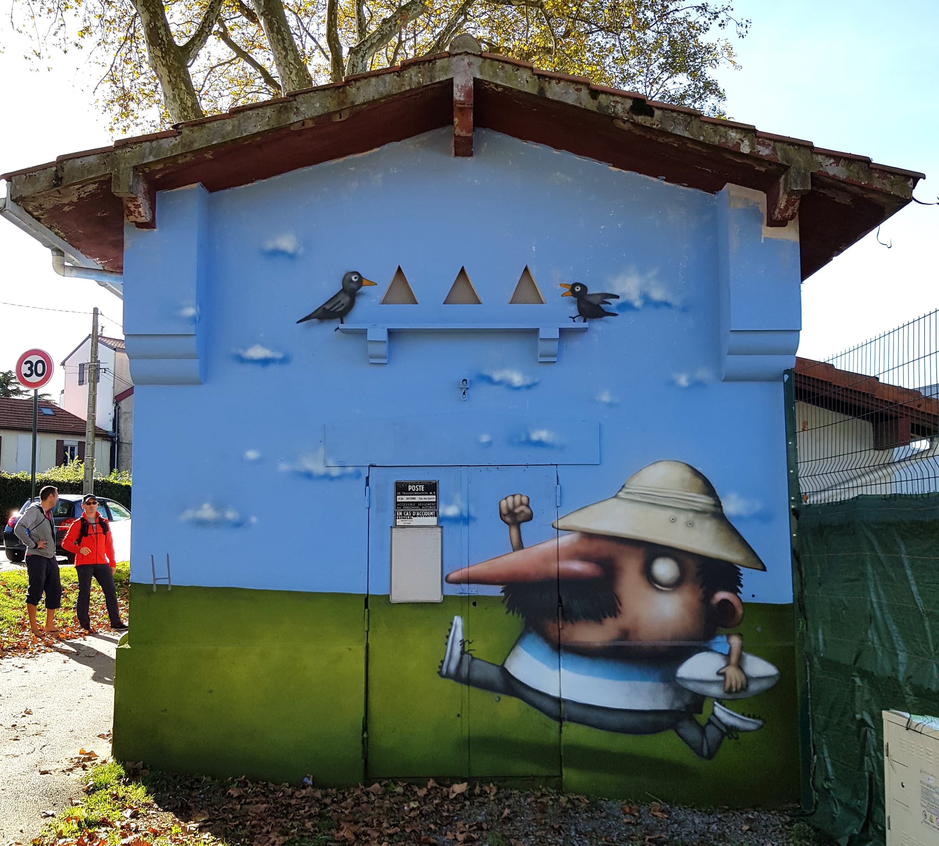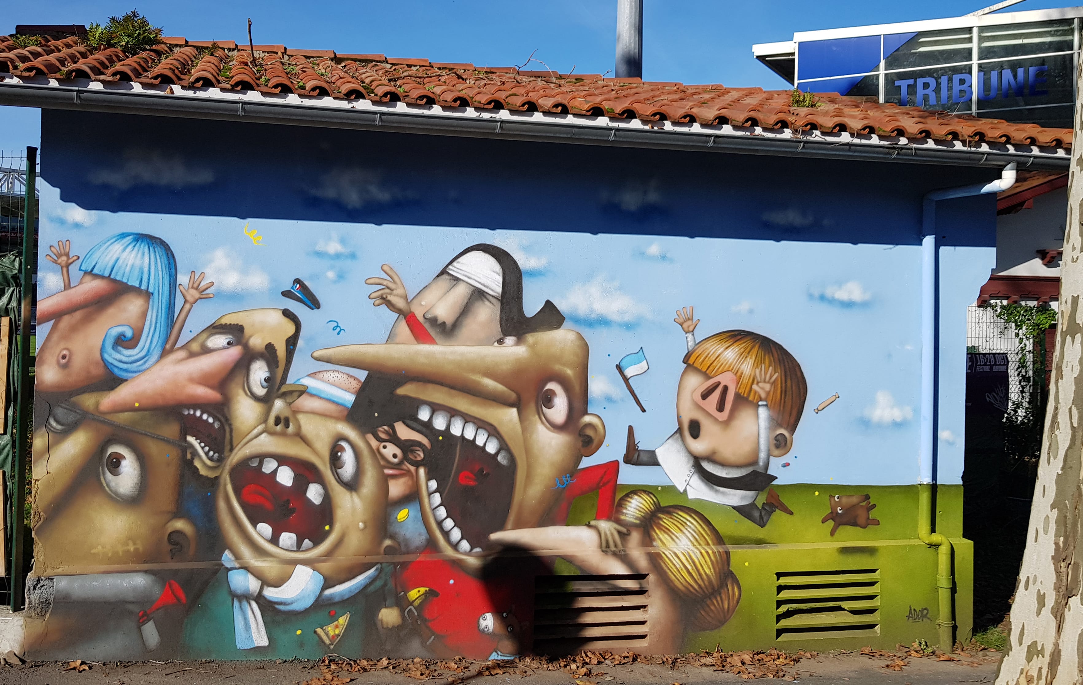 The artwork is of graffiti type. You can admire it in the city of Bayonne in France and more precisely here : 25 Av. Dr Léon Moynac, 64100 Bayonne, France.
