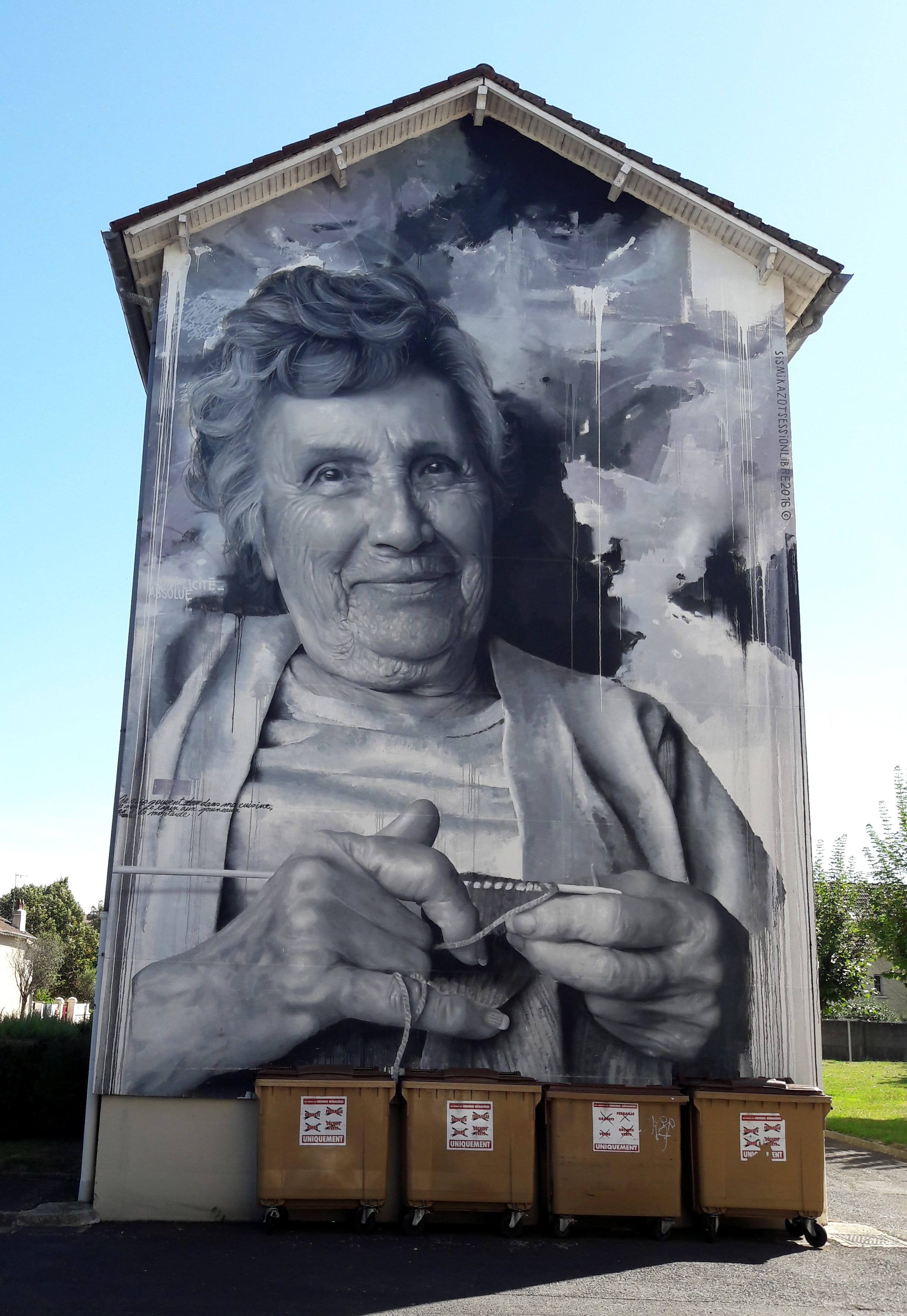 The artwork is of graffiti type. You can admire it in the city of Aurillac in France and more precisely here : 16 Rue de Marmiesse, 15000 Aurillac, France.