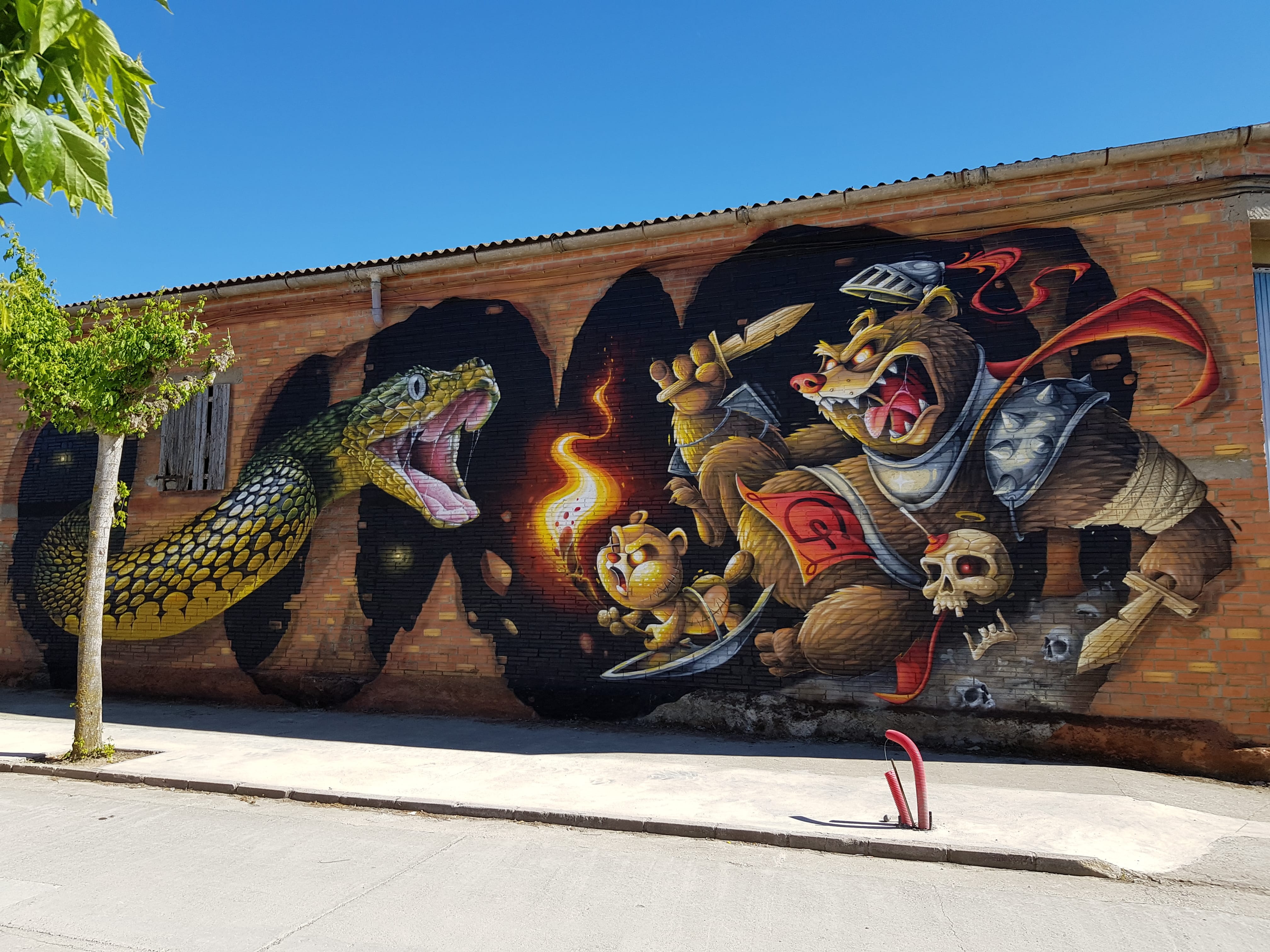 The artwork is of graffiti type. You can admire it in the city of Penelles in Spain and more precisely here : Carrer Moragues, 20, 25335 Penelles, Lleida, Spain.