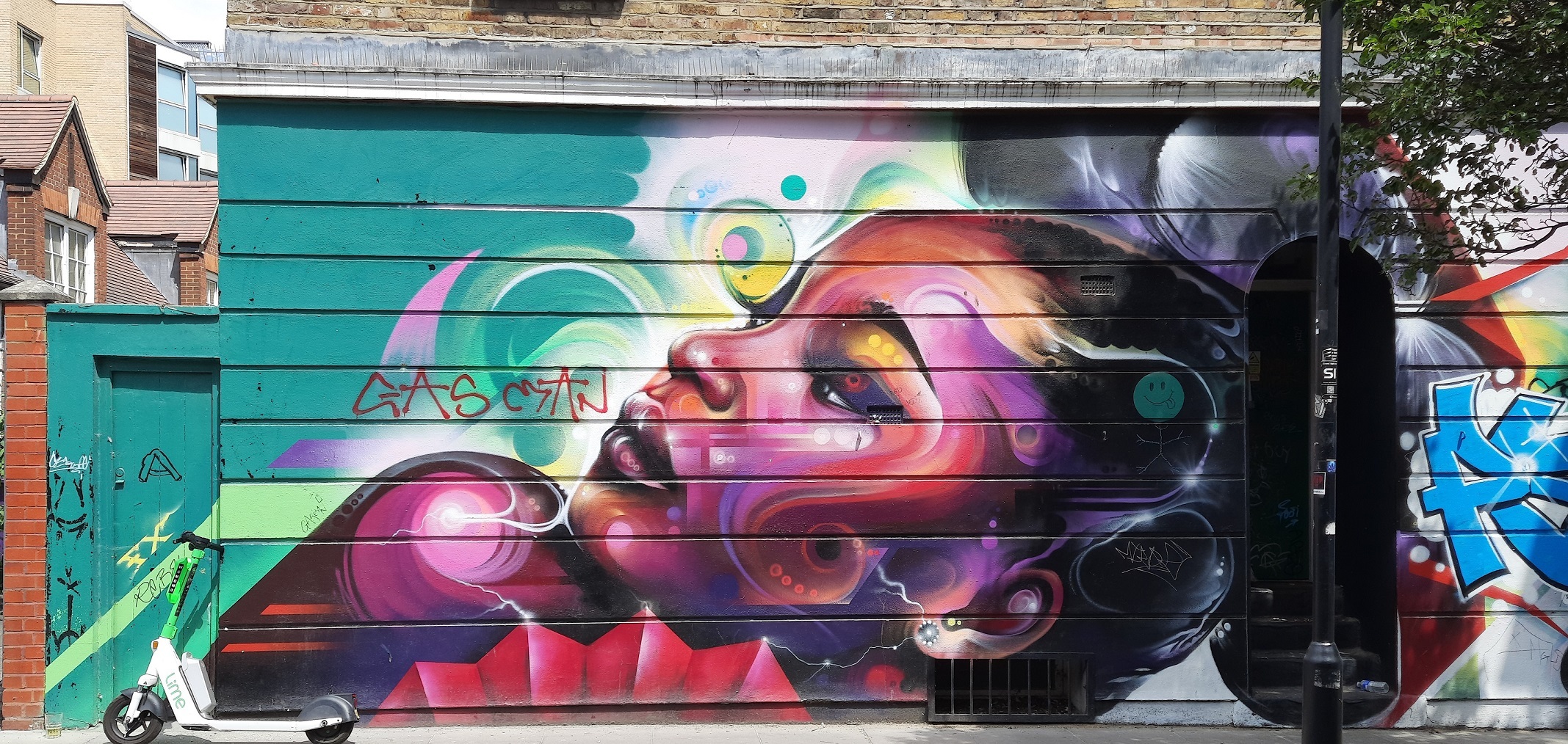 The artwork is of graffiti type. You can admire it in the city of London in United Kingdom and more precisely here : 7-5 Buck St, London NW1 8NJ, UK.