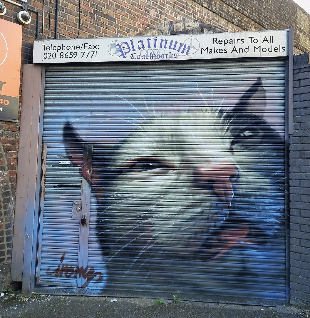 The artwork is of graffiti type. You can admire it in the city of London in United Kingdom and more precisely here : The Alexandra, 163A Parish Ln, London SE20 7JH, UK.