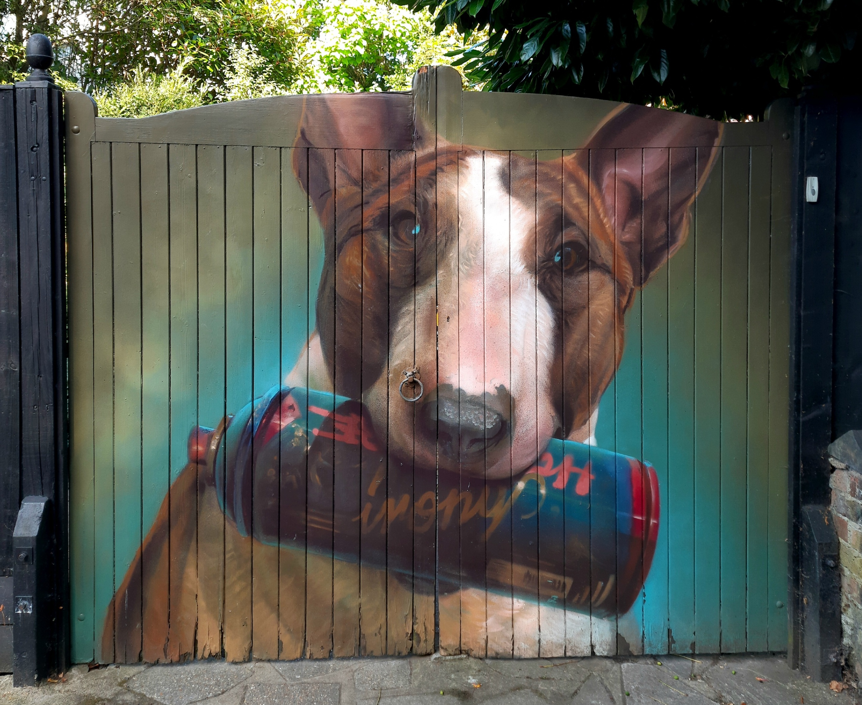 The artwork is of graffiti type. You can admire it in the city of London in United Kingdom and more precisely here : 15 Parish Ln, London SE20 7LH, UK.