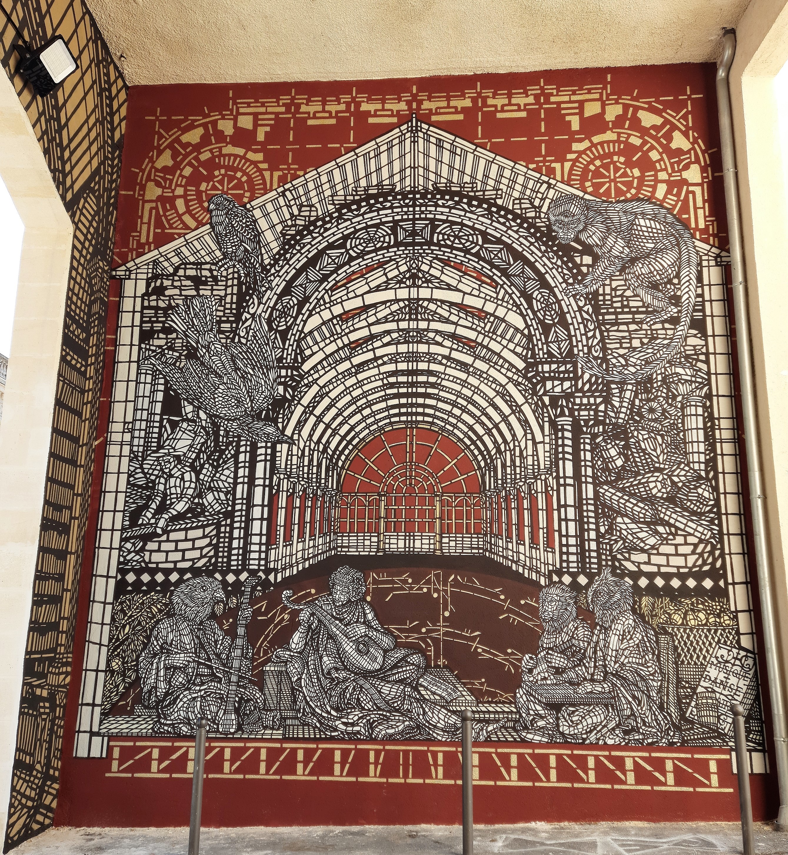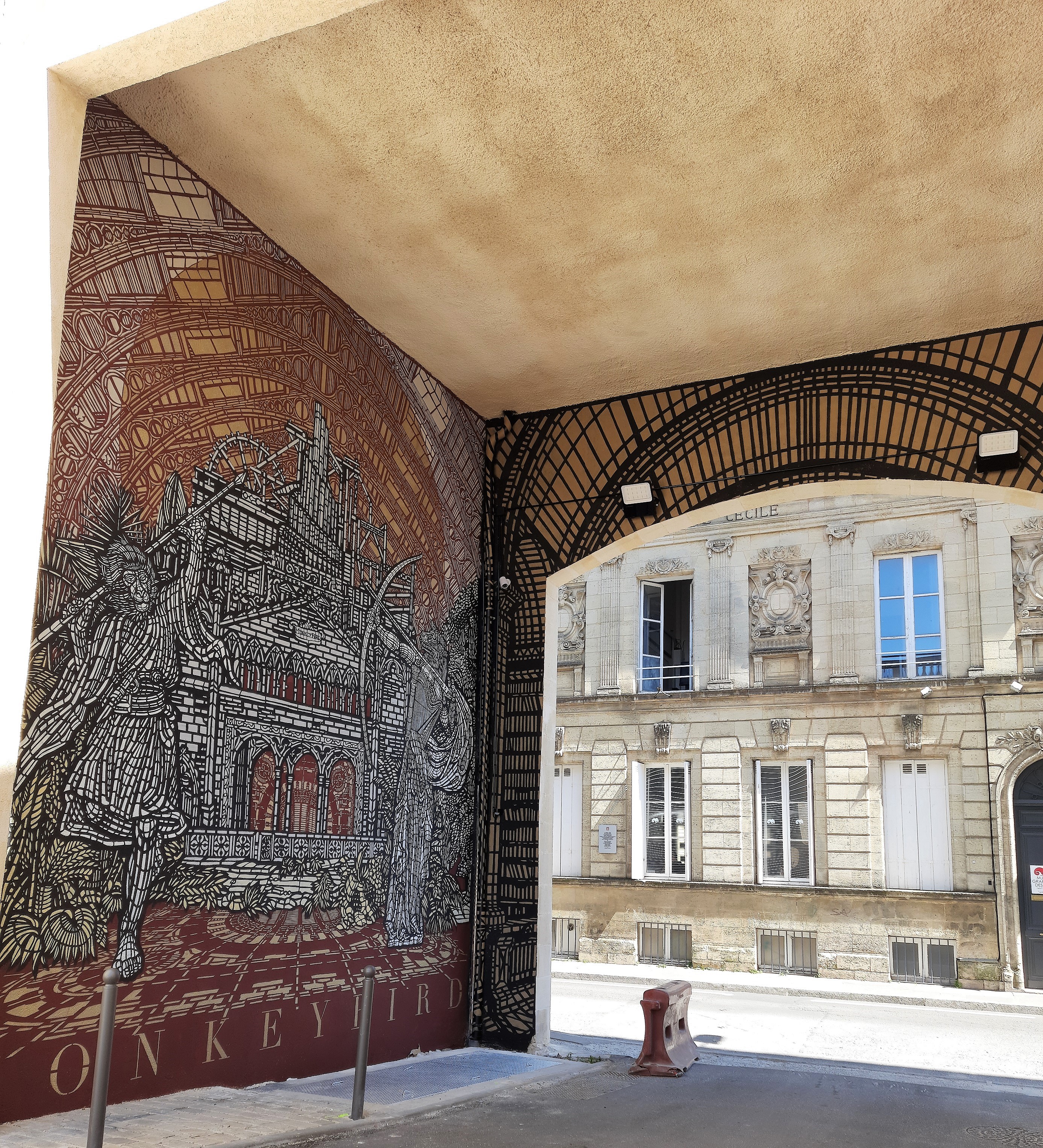 The artwork is of graffiti type. You can admire it in the city of Bordeaux in France and more precisely here : 121 Rue du Dr Albert Barraud, 33000 Bordeaux, France.