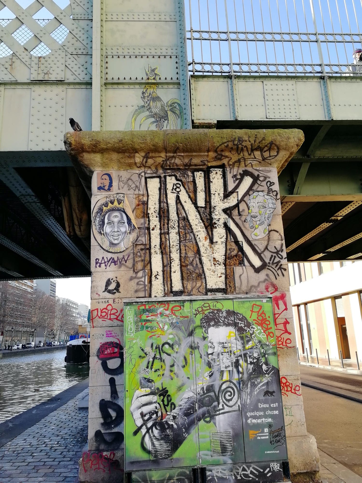 The artwork is of graffiti type. You can admire it in the city of Paris in France and more precisely here : 13 Quai de l'Oise, 75019 Paris, France.