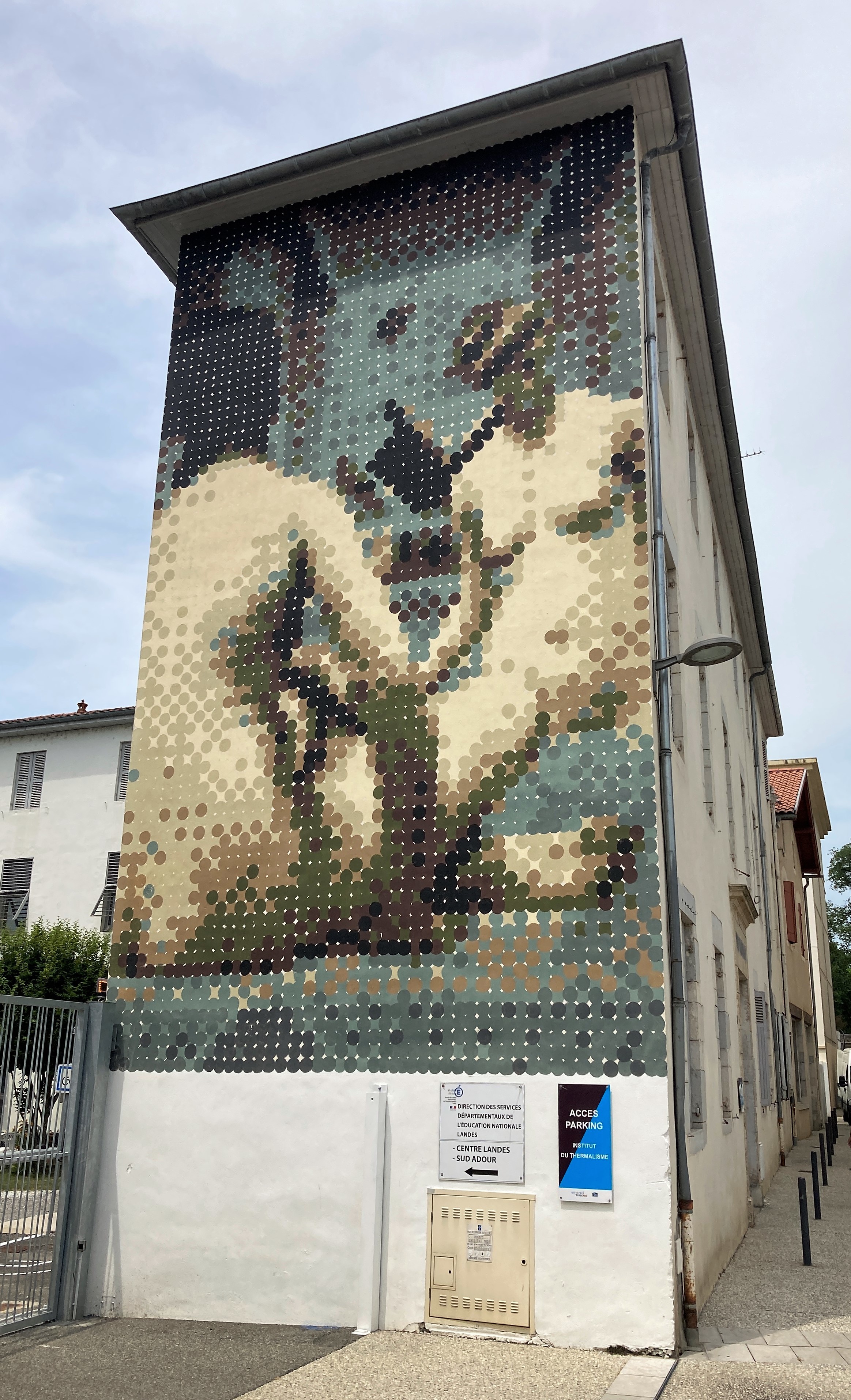 The artwork is of graffiti type. You can admire it in the city of Dax in France and more precisely here : 2 Pl. de la Course, 40100 Dax, France.