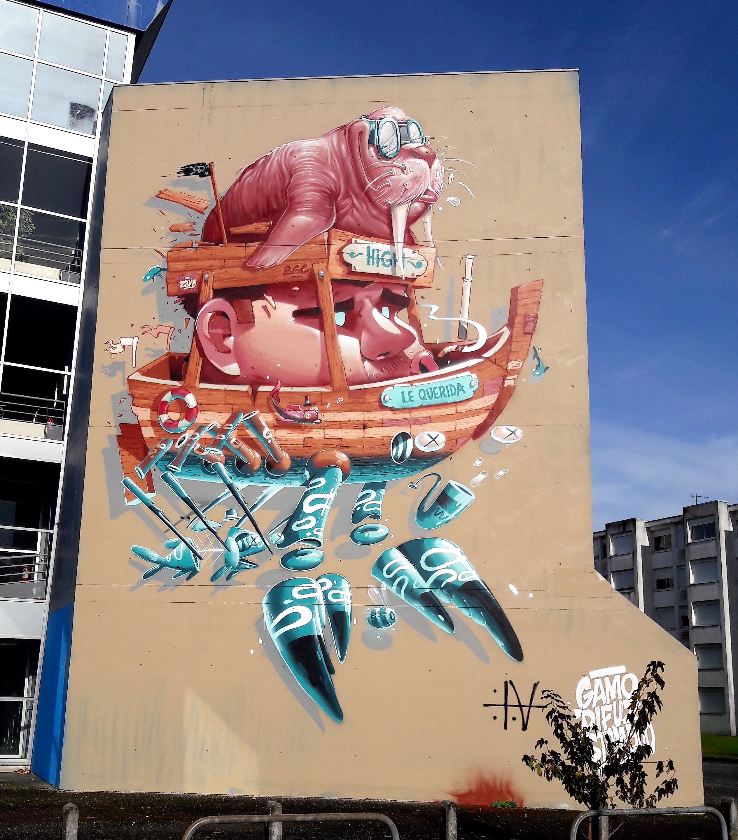 The artwork Le Querida, Shakewell Festival is of graffiti type. You can admire it in the city of Pessac in France and more precisely here : All. Paulin de Nole, 33600 Pessac, France.