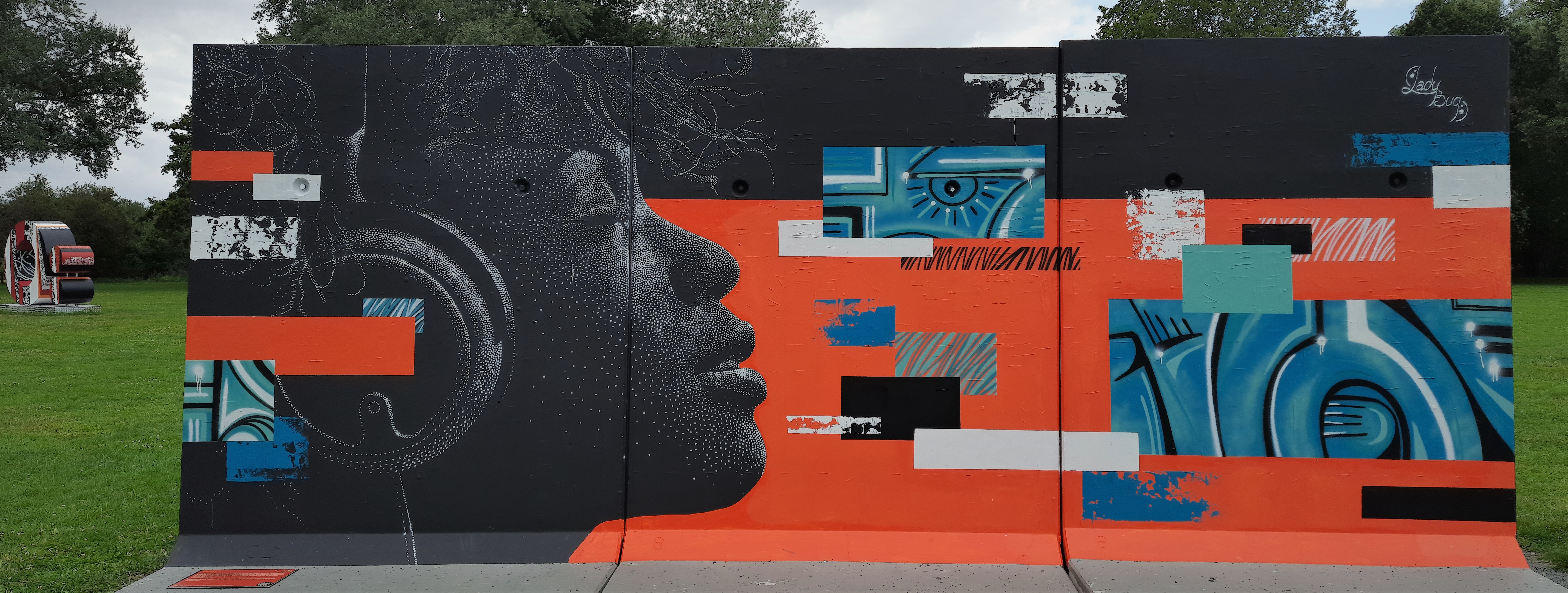 The artwork is of graffiti type. You can admire it in the city of Le Mans in France and more precisely here : 92 Rue d'Arnage, 72100 Le Mans, France.