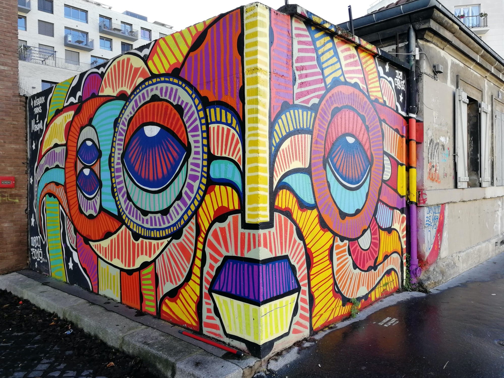 The artwork is of graffiti type. You can admire it in the city of Paris in France and more precisely here : 30 Quai de la Marne, 75019 Paris, France.
