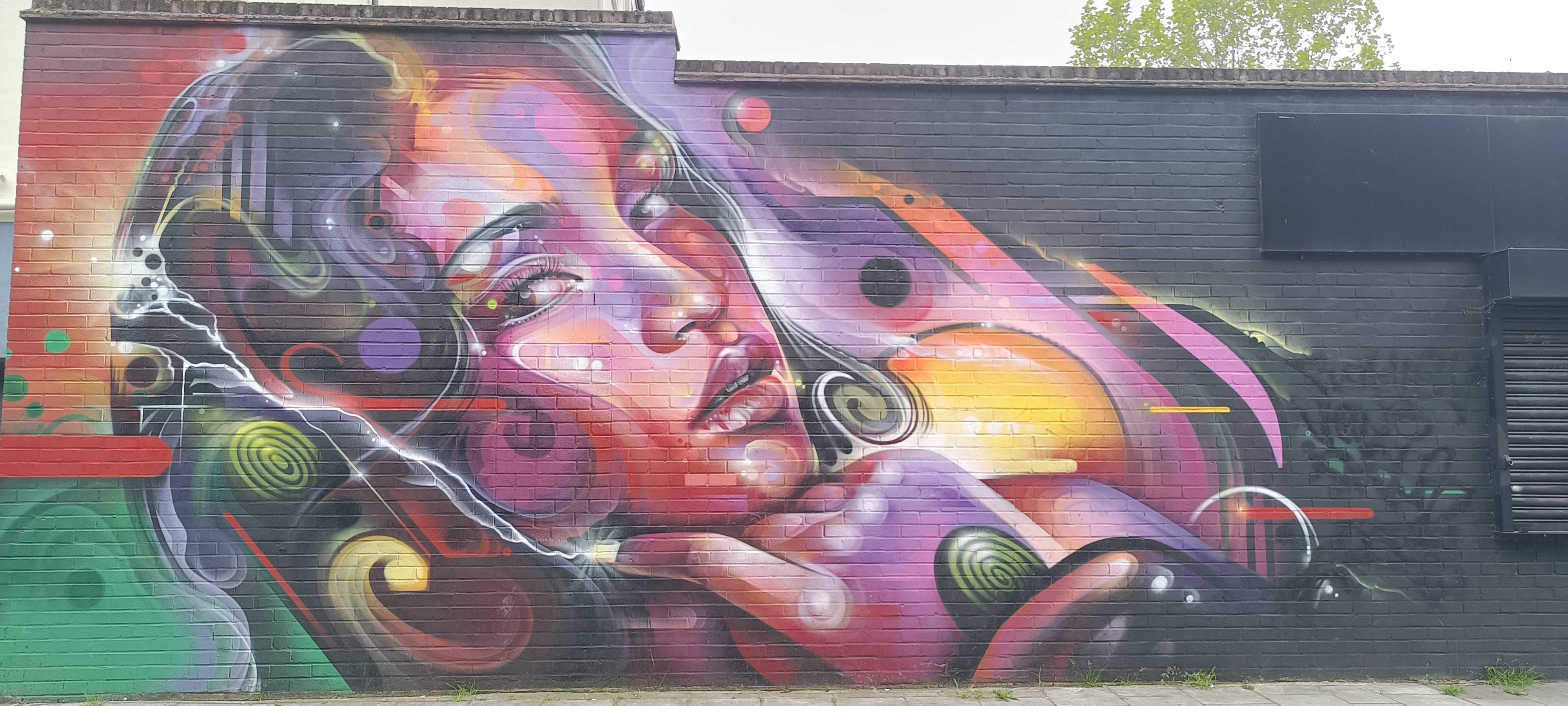 The artwork is of graffiti type. You can admire it in the city of England in United Kingdom and more precisely here : 91 Brixton Hill, London SW2 1AA, UK.