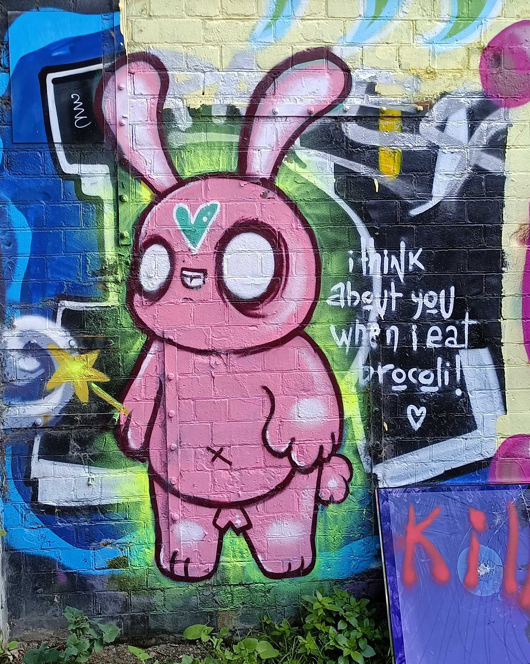 The artwork I think about you when I eat broccoli is of graffiti type. You can admire it in the city of England in United Kingdom and more precisely here : 28 Dace Rd, Fish Island, London E3 2NX, UK.