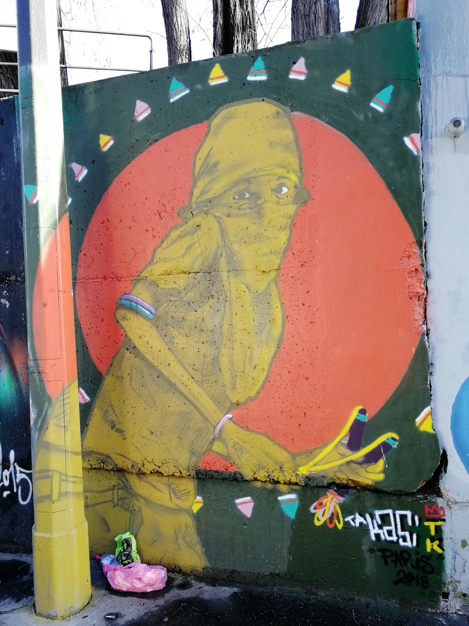 The artwork is of graffiti type. You can admire it in the city of Paris in France and more precisely here : 13 Rue de l'Ourcq, 75019 Paris, France.