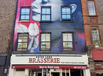The artwork is of graffiti type. You can admire it in the city of England in United Kingdom and more precisely here : 15 Hanbury St, London E1 6QR, UK.