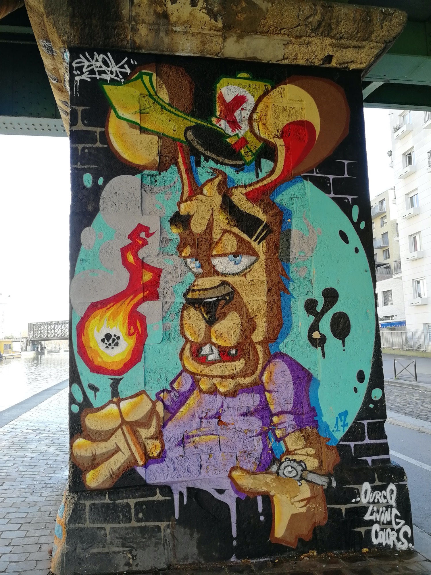 The artwork is of graffiti type. You can admire it in the city of Paris in France and more precisely here : Passerelle des Ardennes, 24a Rue de l'Ourcq, 75019 Paris, France.