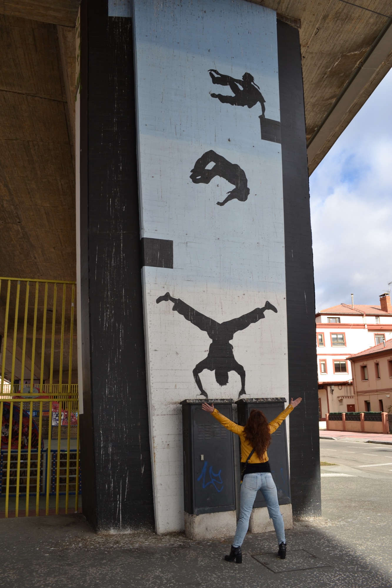 The artwork Parkour is of graffiti type. You can admire it in the city of Burgos in Spain and more precisely here : Avenida Valencia del Cid, 09002,Burgos, España.