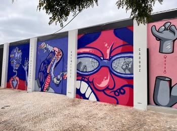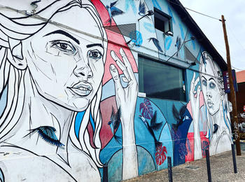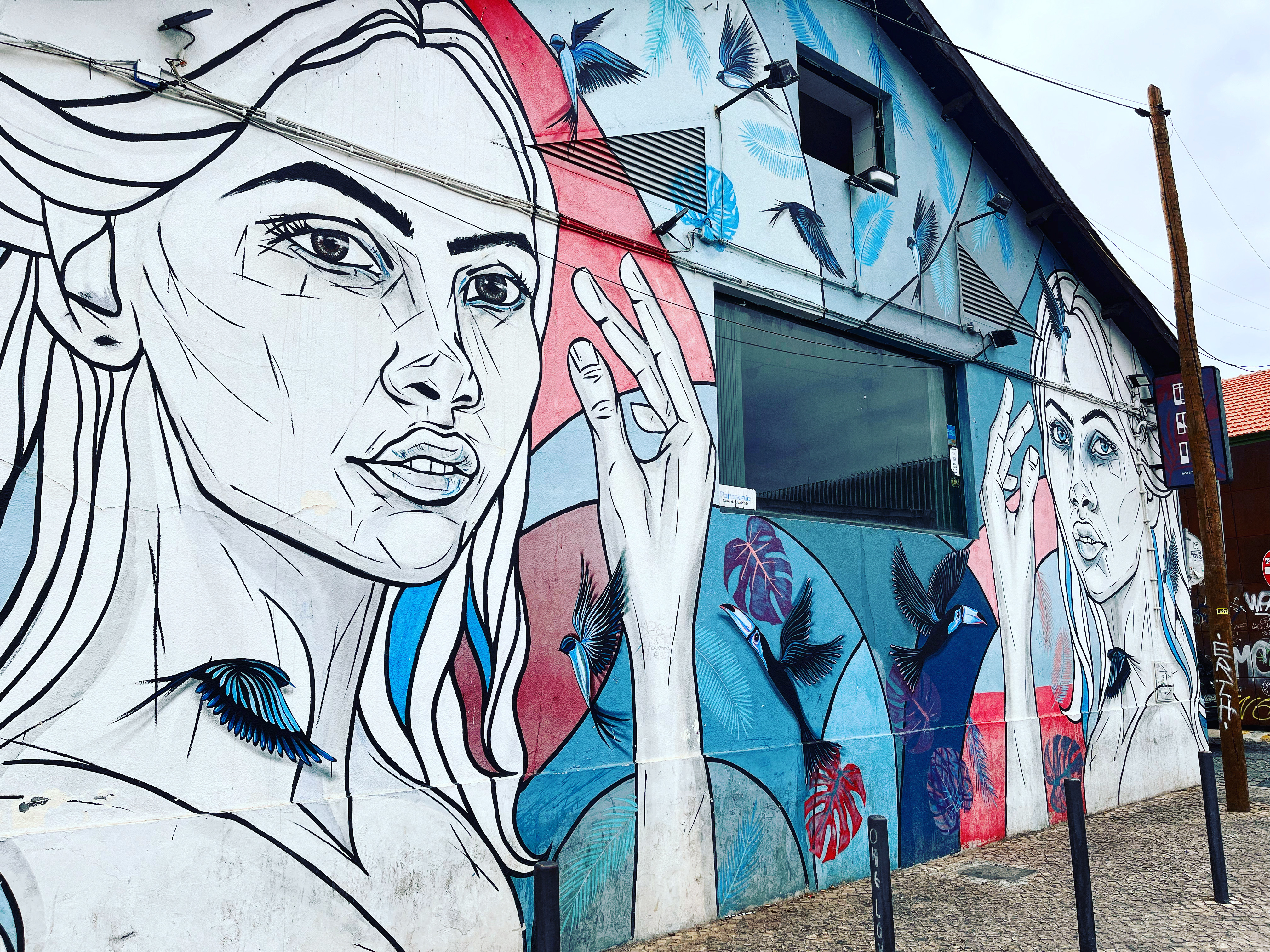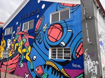 The artwork is of graffiti type. You can admire it in the city of Lisboa in Portugal and more precisely here : Cais Gás 1, 1200-161 Lisboa, Portugal.