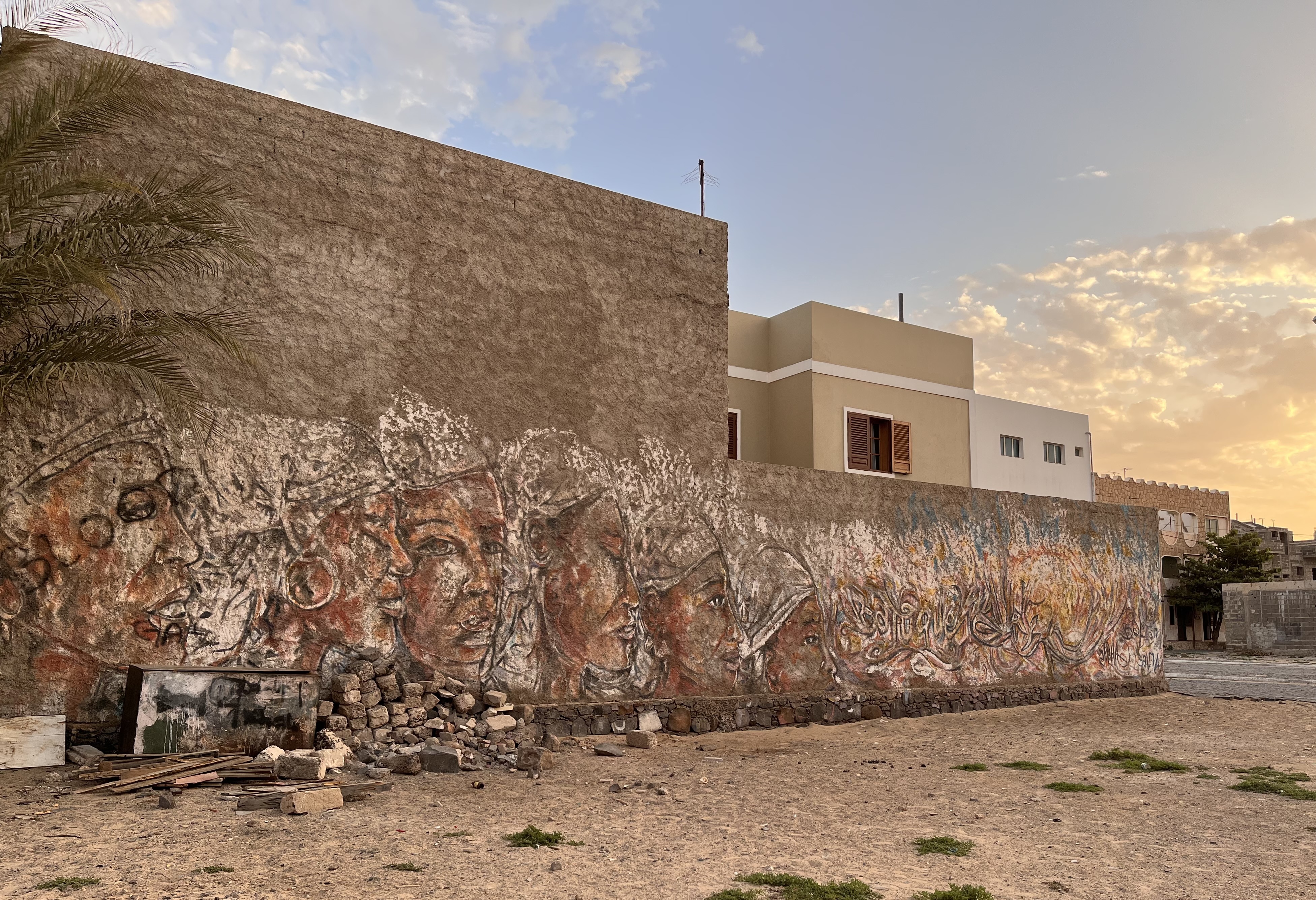 The artwork is of graffiti type. You can admire it in the city of Sal Rei in Cabo Verde and more precisely here : 53HM+9P7, Sal Rei, Cabo Verde.