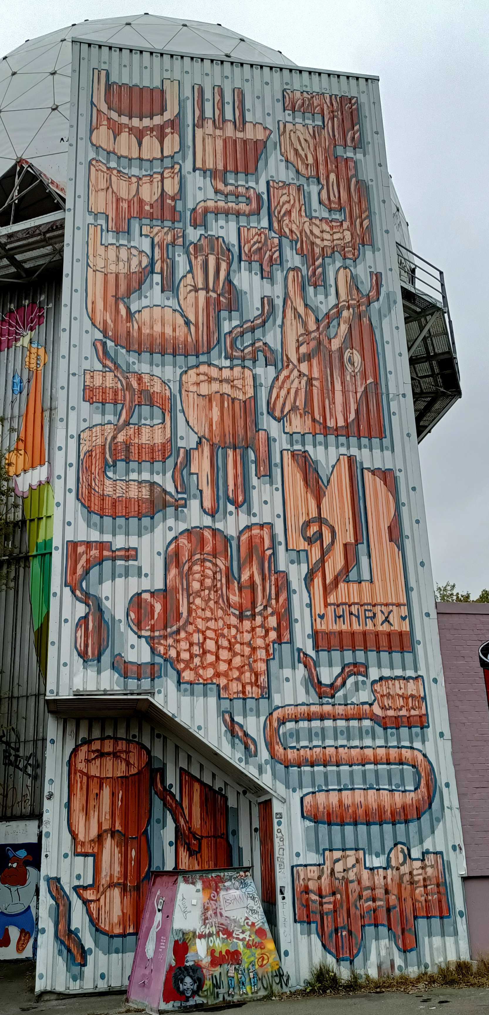 The artwork is of graffiti type. You can admire it in the city of Berlin in Germany and more precisely here : Teufelsseechaussee 10, 14193 Berlin, Germany.