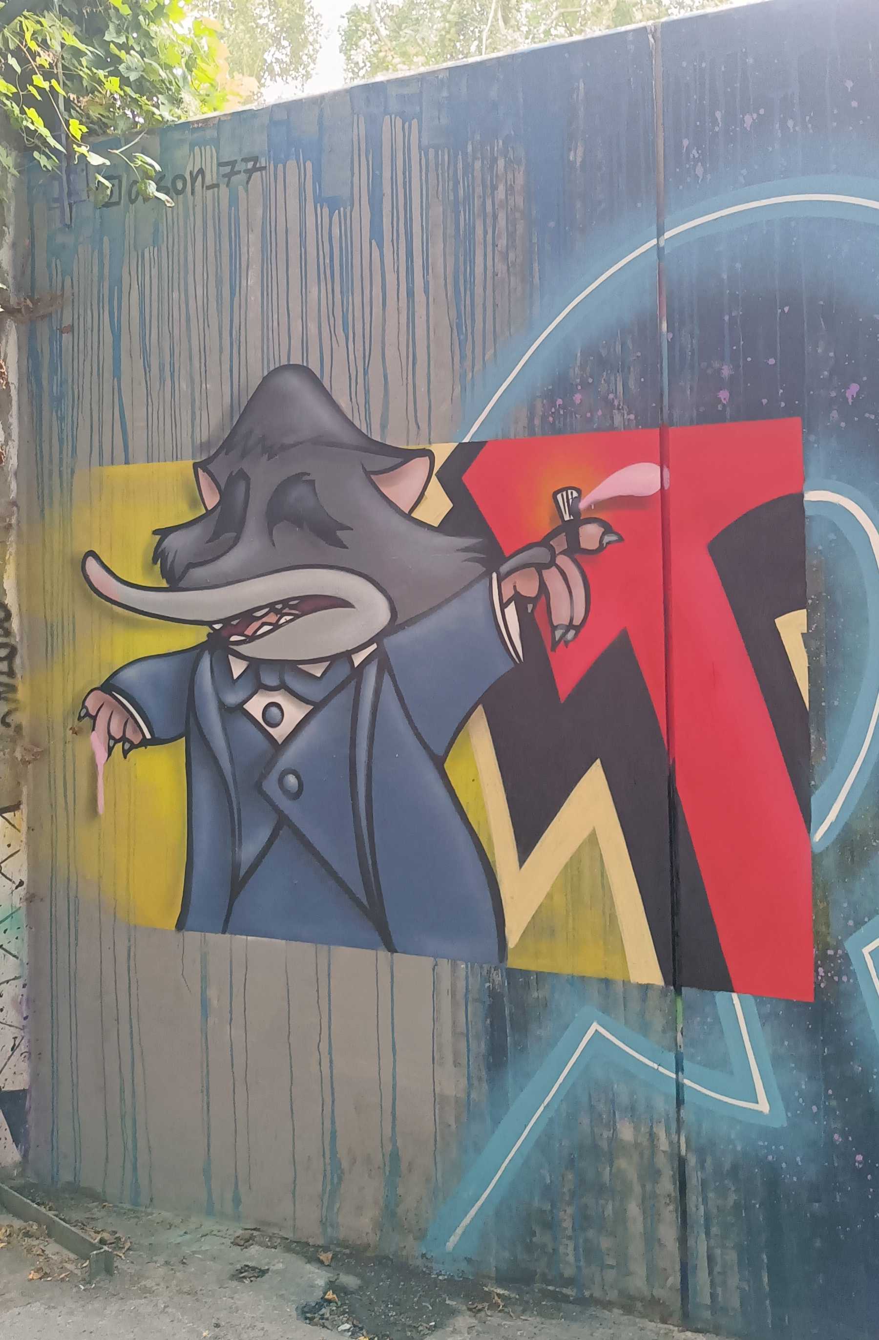 The artwork is of graffiti type. You can admire it in the city of Berlin in Germany and more precisely here : Teufelsseechaussee 10, 14193 Berlin, Germany.
