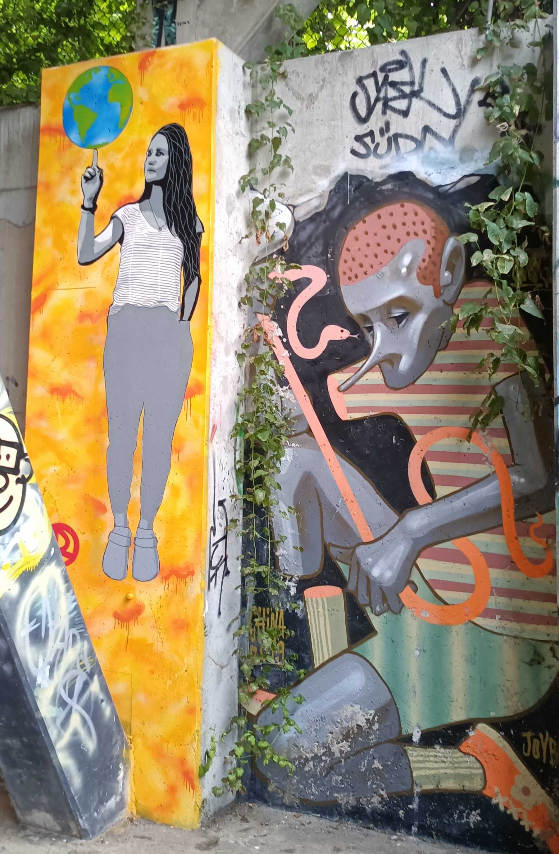 The artwork is of graffiti type. You can admire it in the city of Berlin in Germany and more precisely here : Teufelsseechaussee 10, 14193 Berlin, Germany.