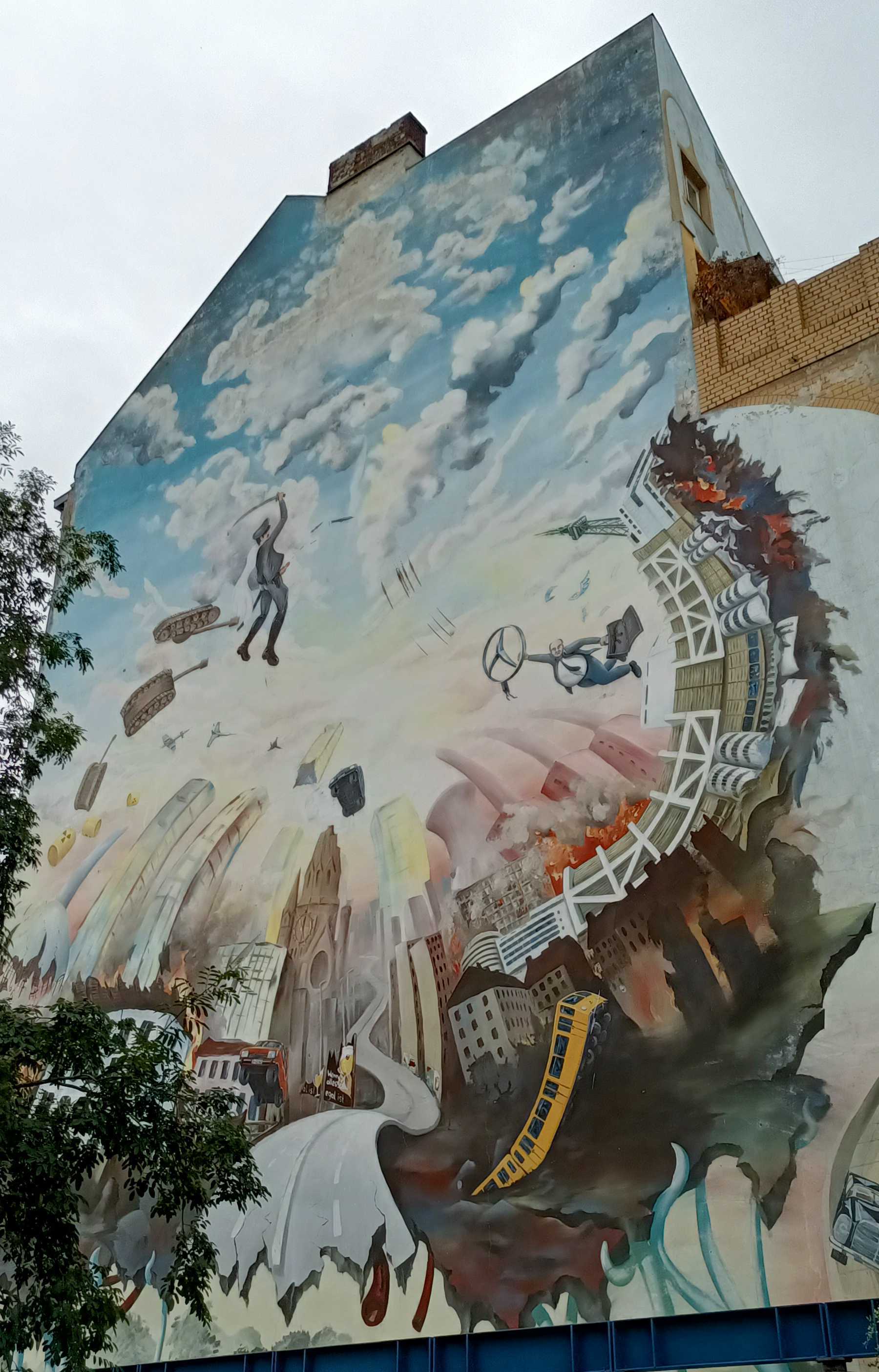 The artwork is of graffiti type. You can admire it in the city of Berlin in Germany and more precisely here : Wilhelmstraße 7, 10963 Berlin, Germany.