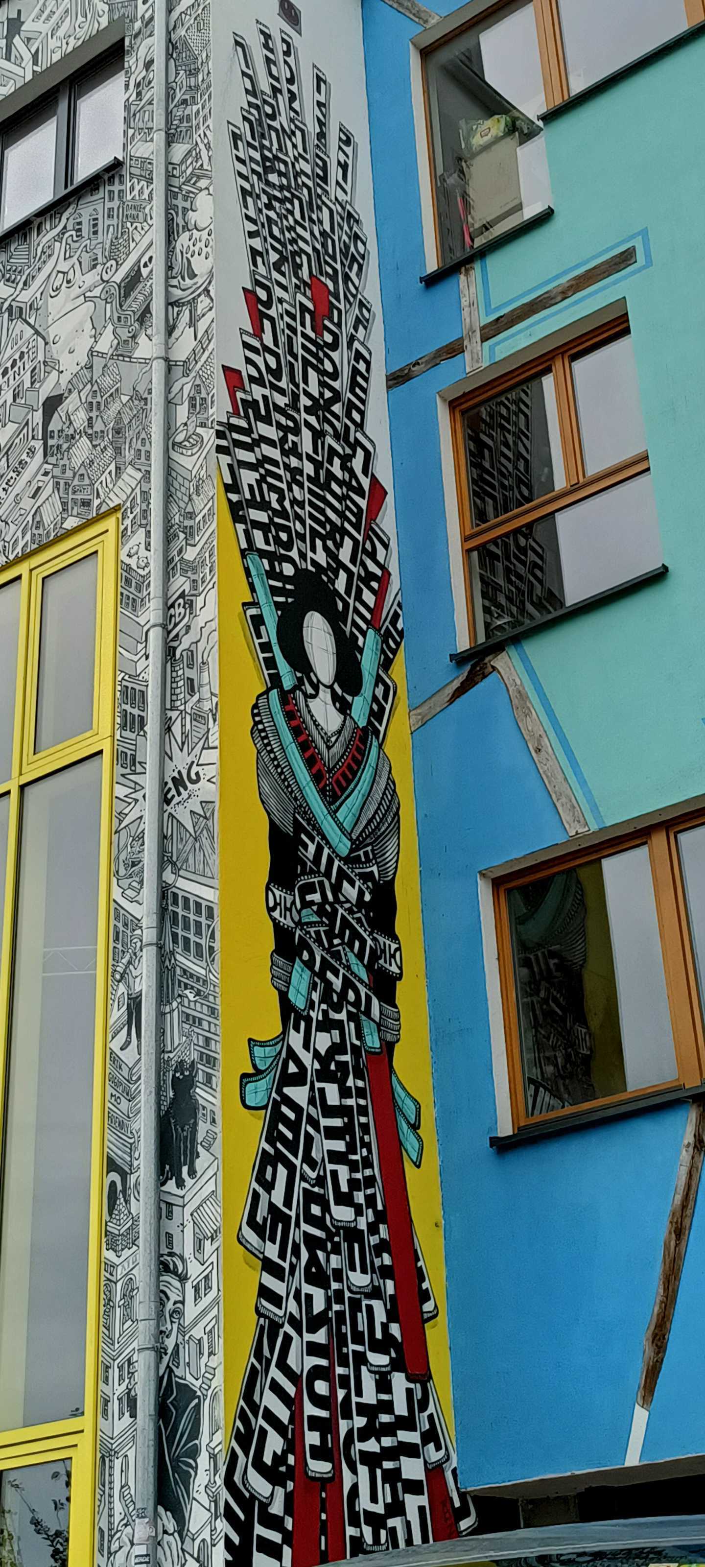 The artwork is of graffiti type. You can admire it in the city of Berlin in Germany and more precisely here : Lichtenberger Str. 40, 10243 Berlin, Germany.