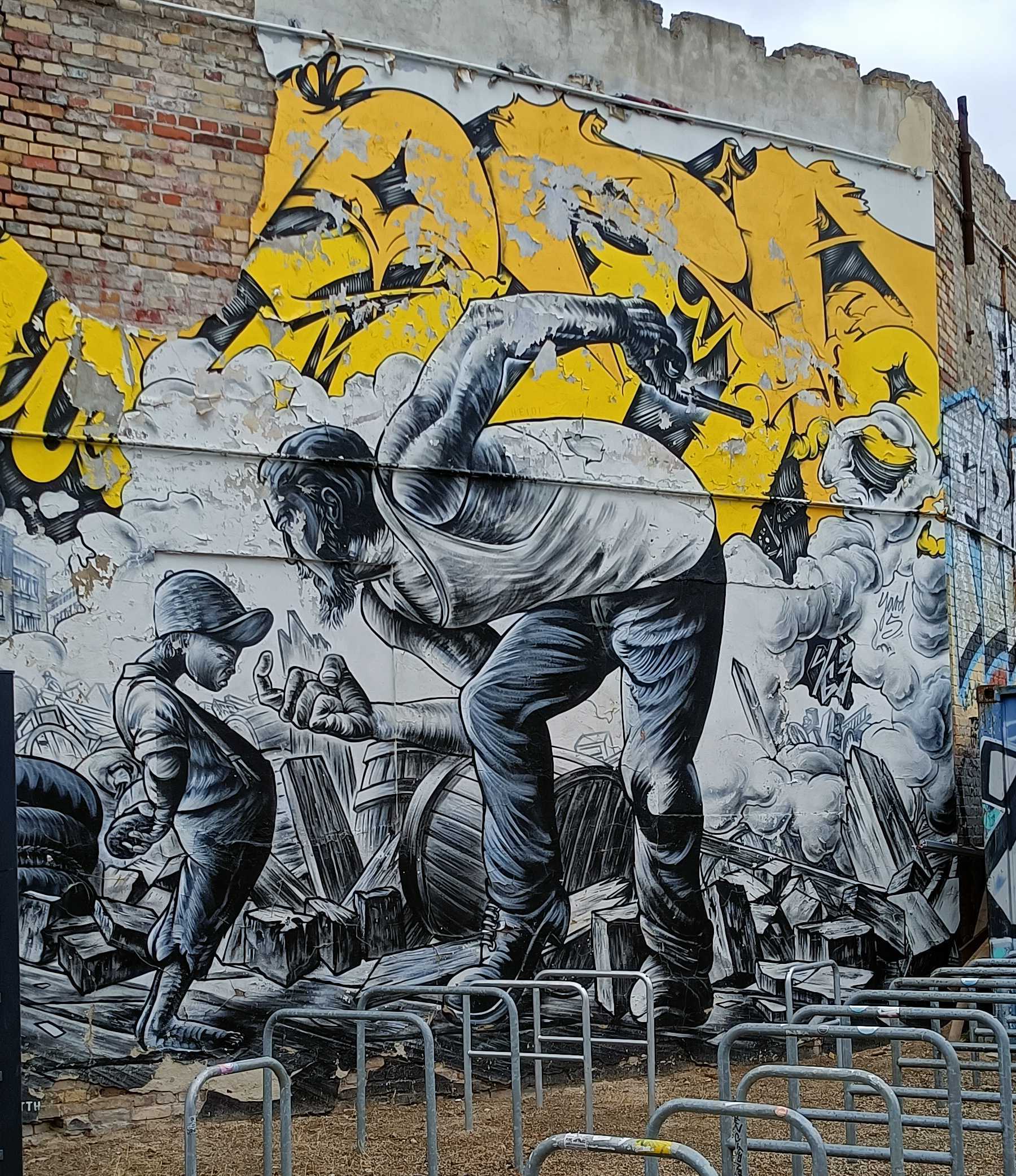 The artwork is of graffiti type. You can admire it in the city of Berlin in Germany and more precisely here : Revaler Str. 99, 10245 Berlin, Germany.