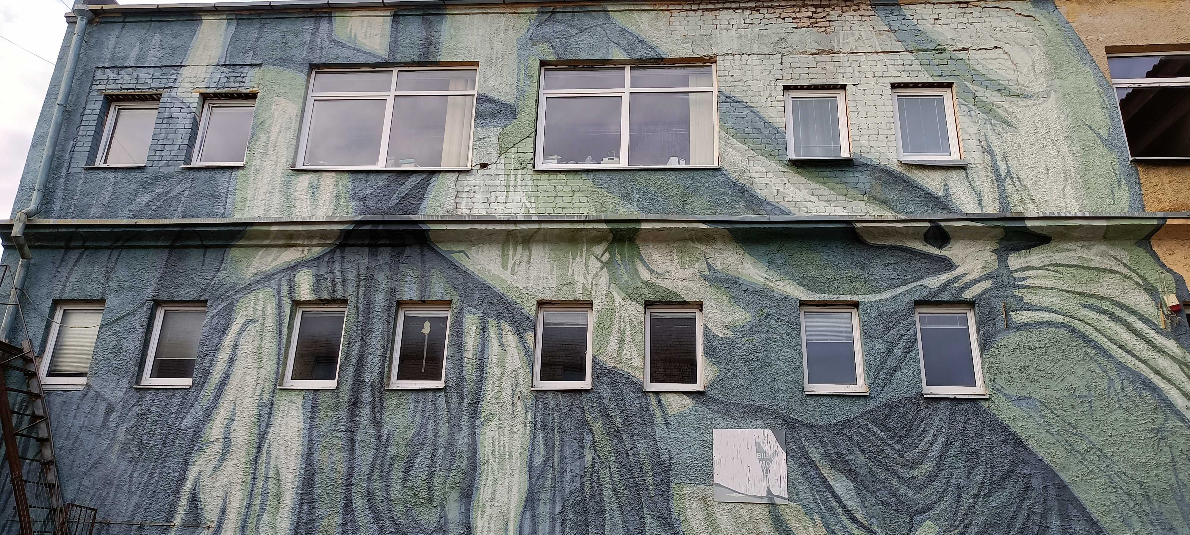 The artwork is of graffiti type. You can admire it in the city of Vilnius in Lithuania and more precisely here : Kauno g. 23, 03209 Vilnius, Lithuania.