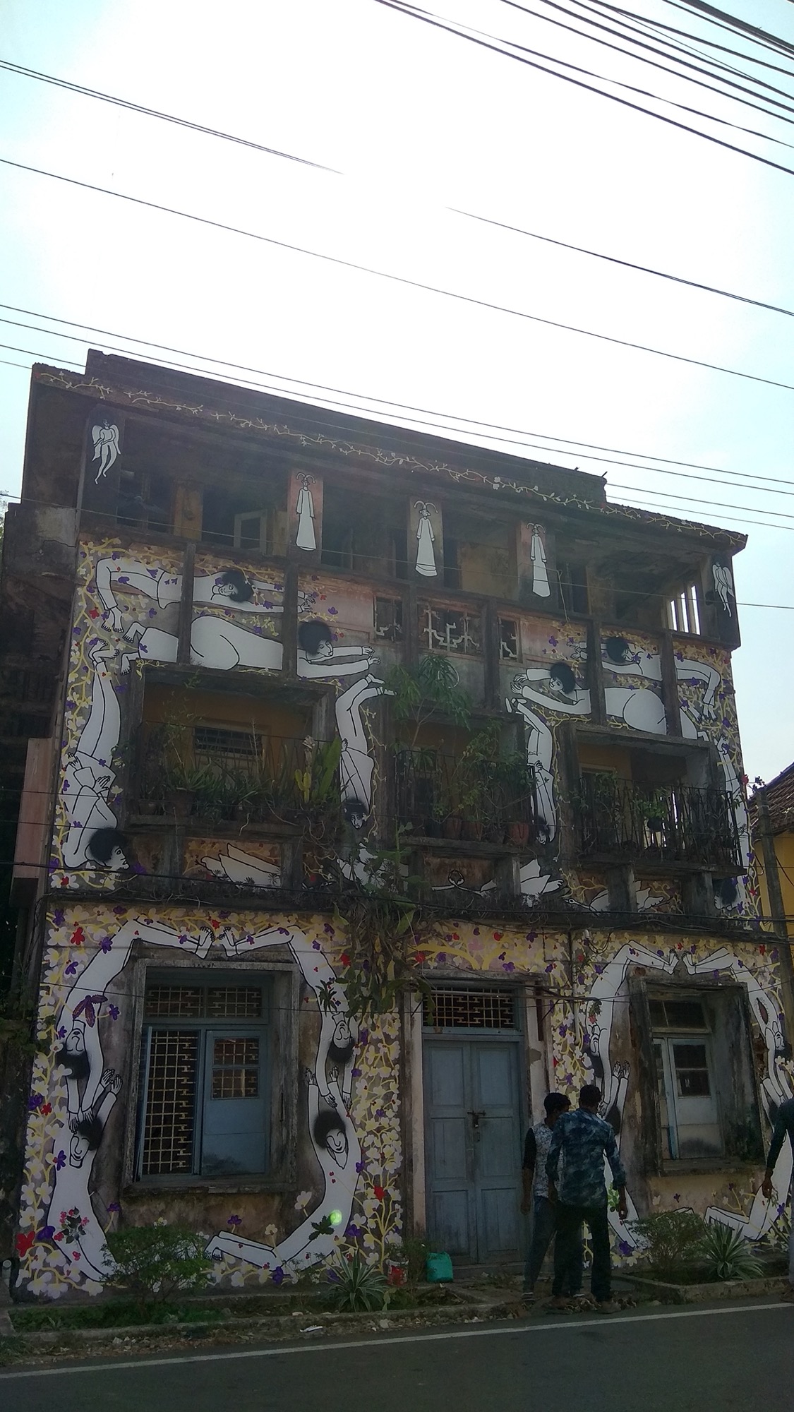 The artwork is of graffiti type. You can admire it in the city of Kochi in India and more precisely here : 1/871(A), KB Jacob Rd, Fort Kochi, Kochi, Kerala 682001, India.